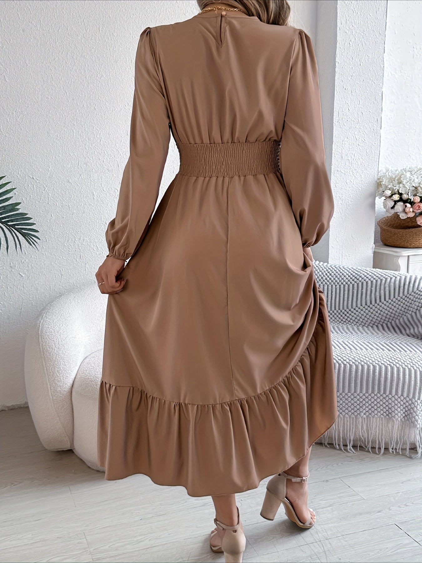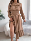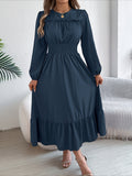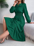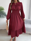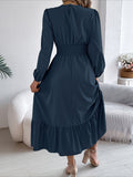 Elegant Solid Color Ruffle Hem Long Sleeve Lapel Collar Midi Dress