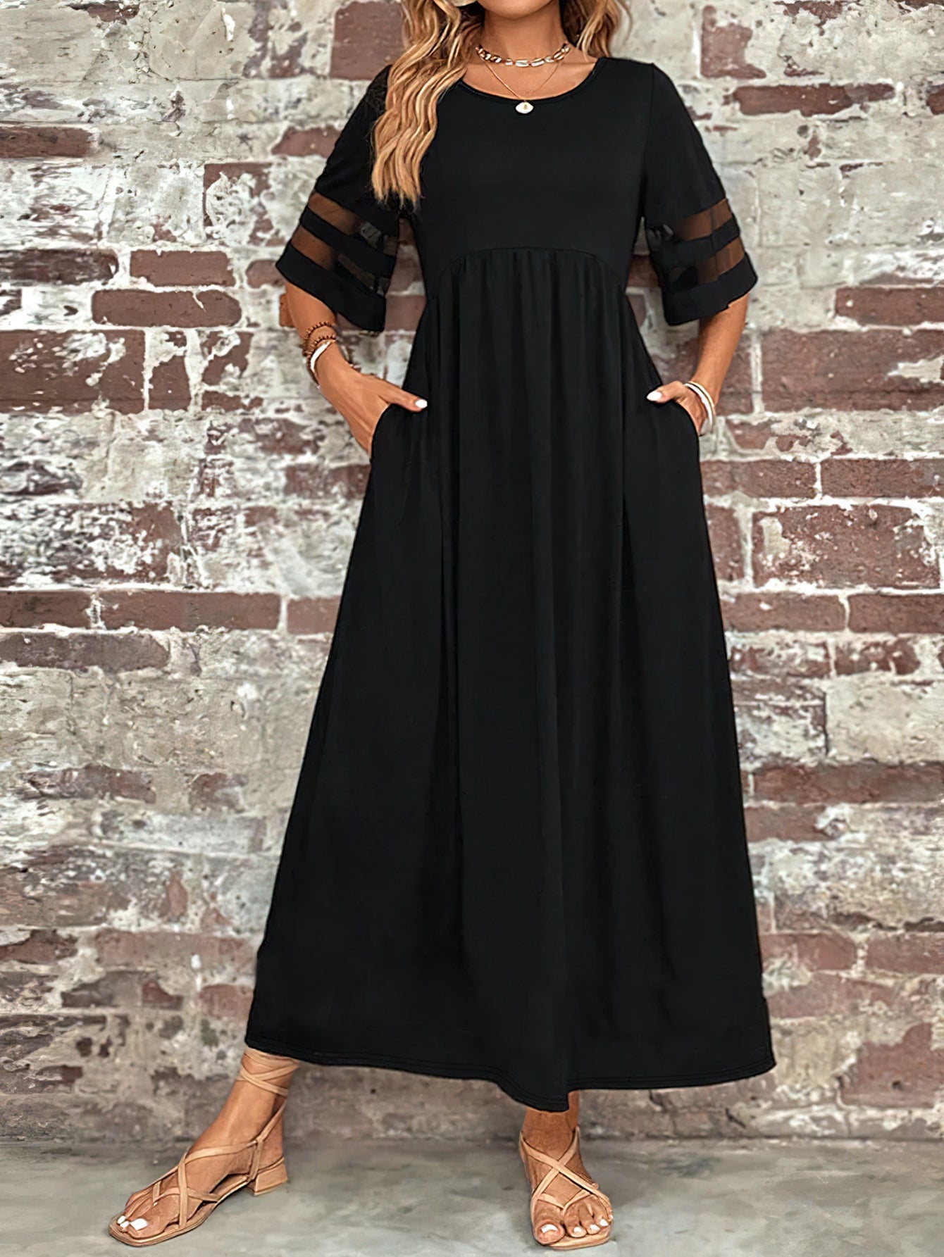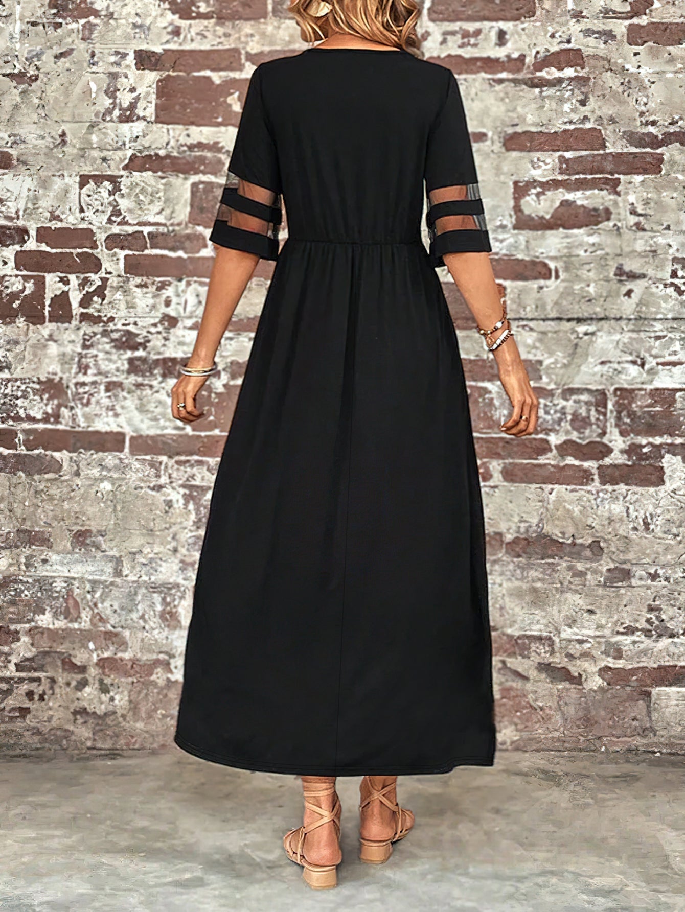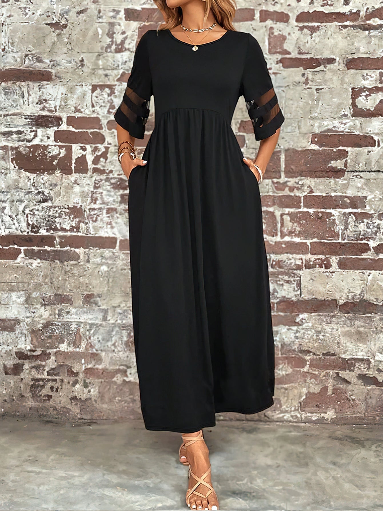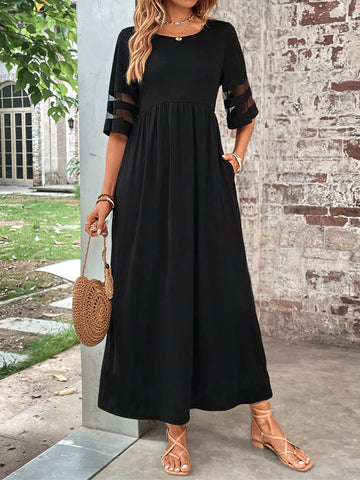 Elegant Crew Neck Solid Color Slimming Mesh Panel Maxi Dress