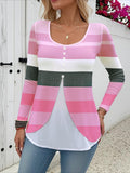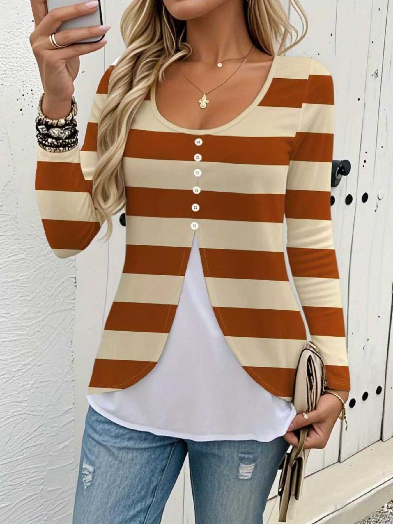 Sale Striped Botton Crew Neck T-Shirt, Elegant Long Sleeve T-Shirt