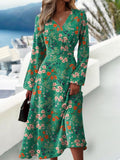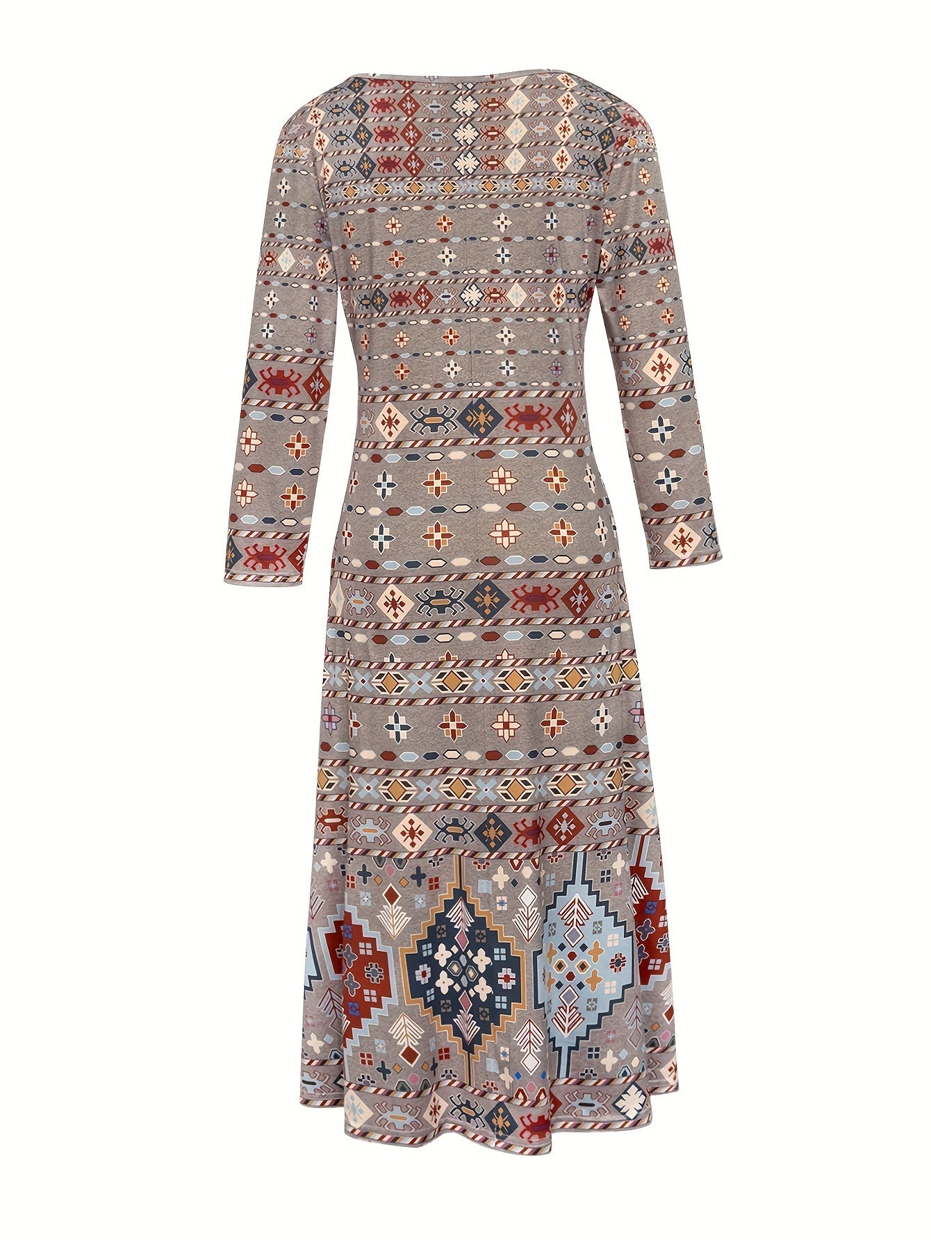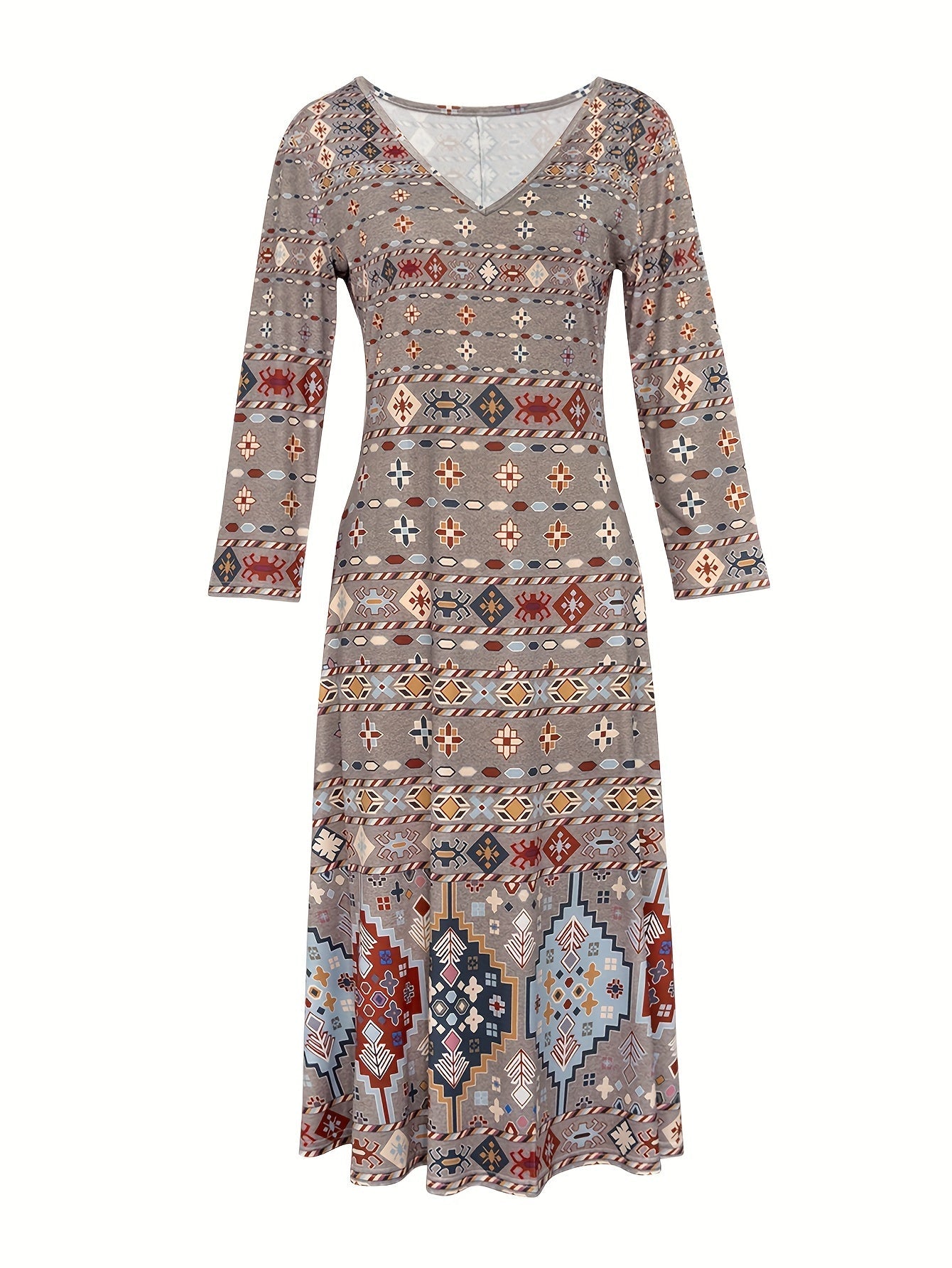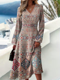 Elegant V-Neck Long Sleeve Geometric Print Knit Fabric Midi Dress