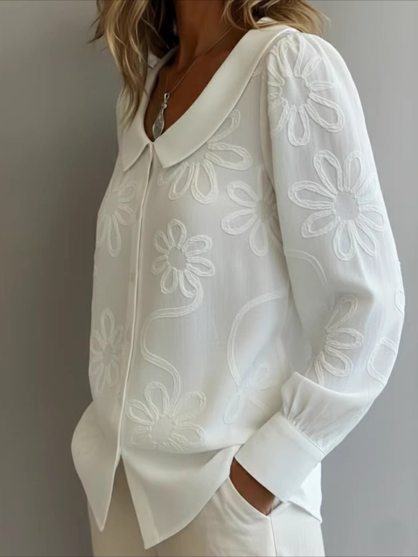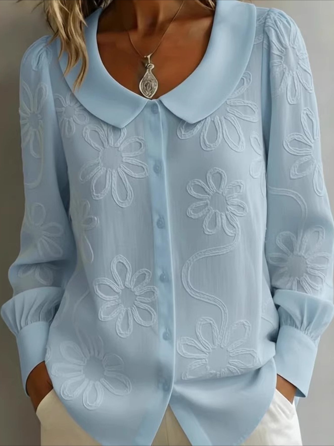 Embroidery Floral Long Sleeve Crew Neck Button Loose Going Out Casual Top
