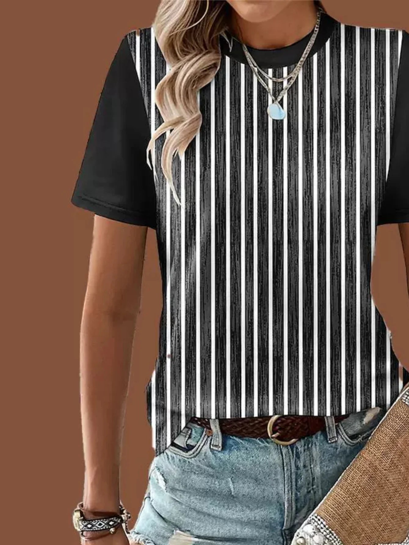 Sale Casual Patchwork Pattern Round Neck Short Sleeve Loose Women T-Shirt