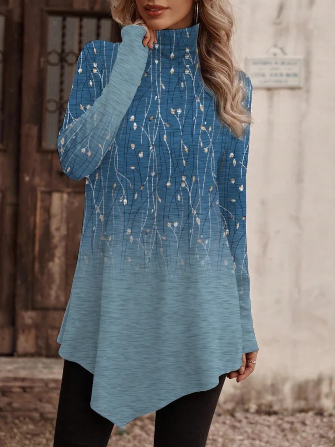 Ethnic Floral Print High Neck Tunics, Boho Long Sleeve Tunic Tops