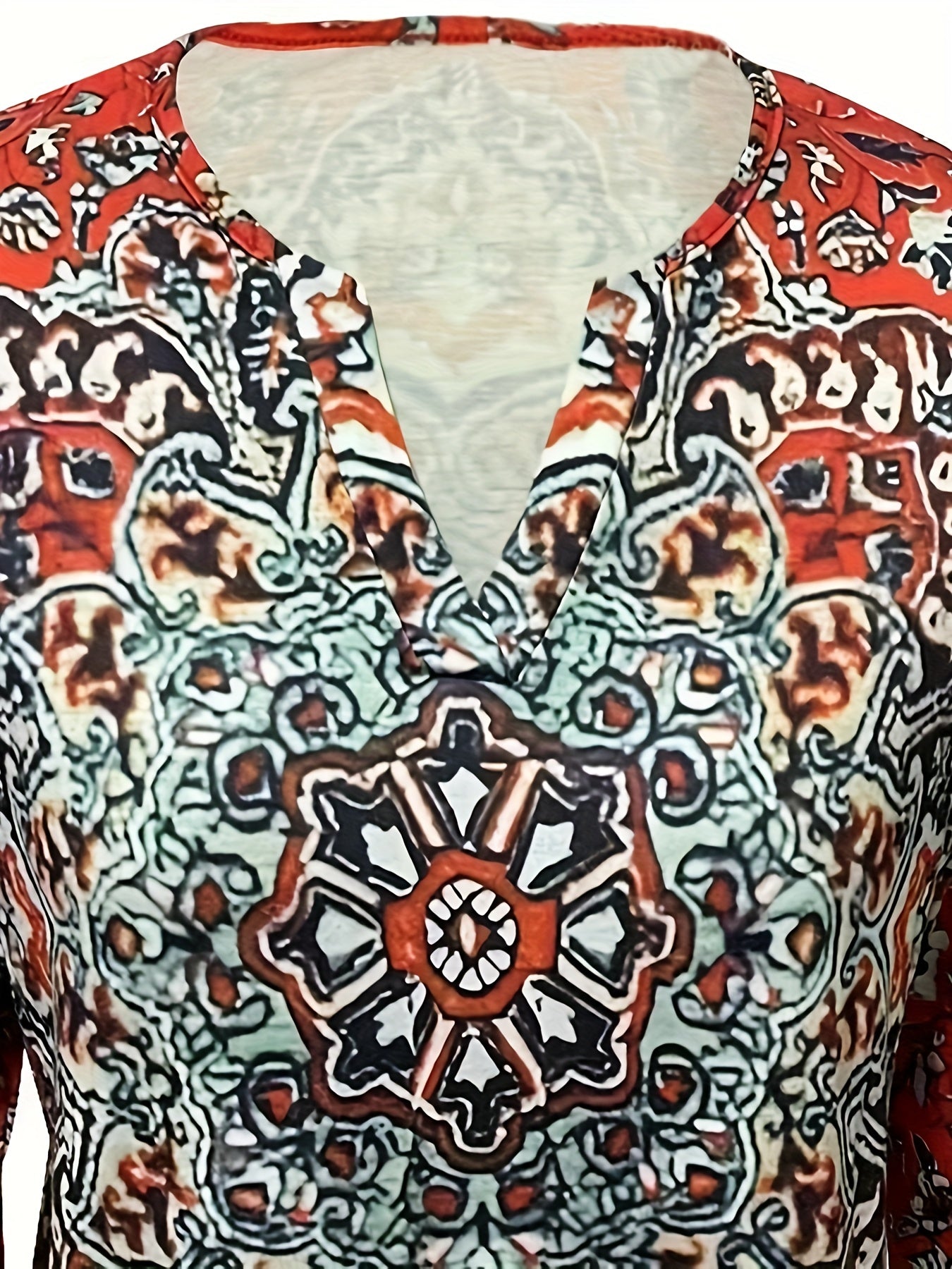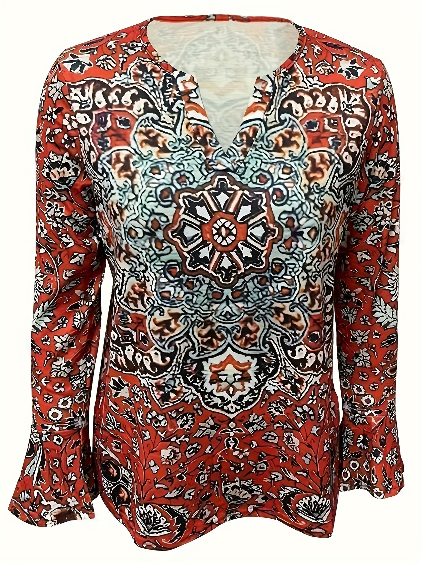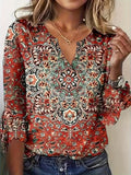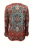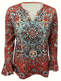 Sale Ethnic Floral Print T-shirt, Vintage Notched Neck Long Sleeve T-shirt