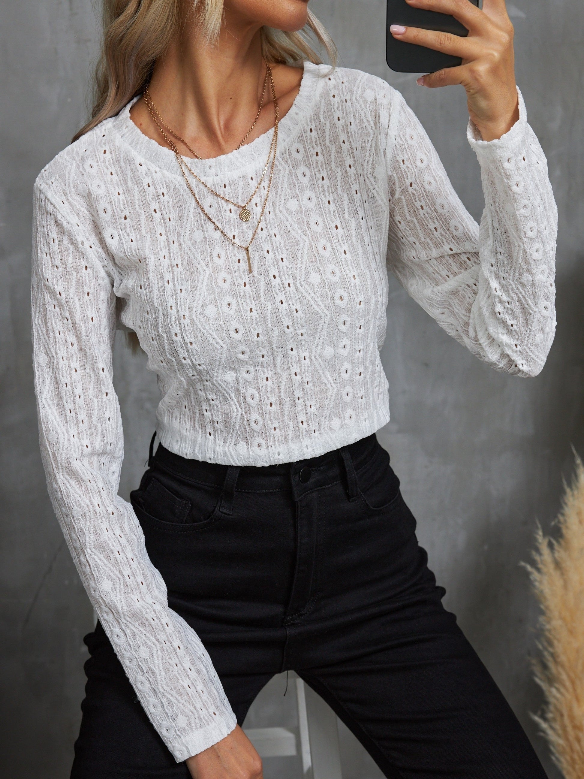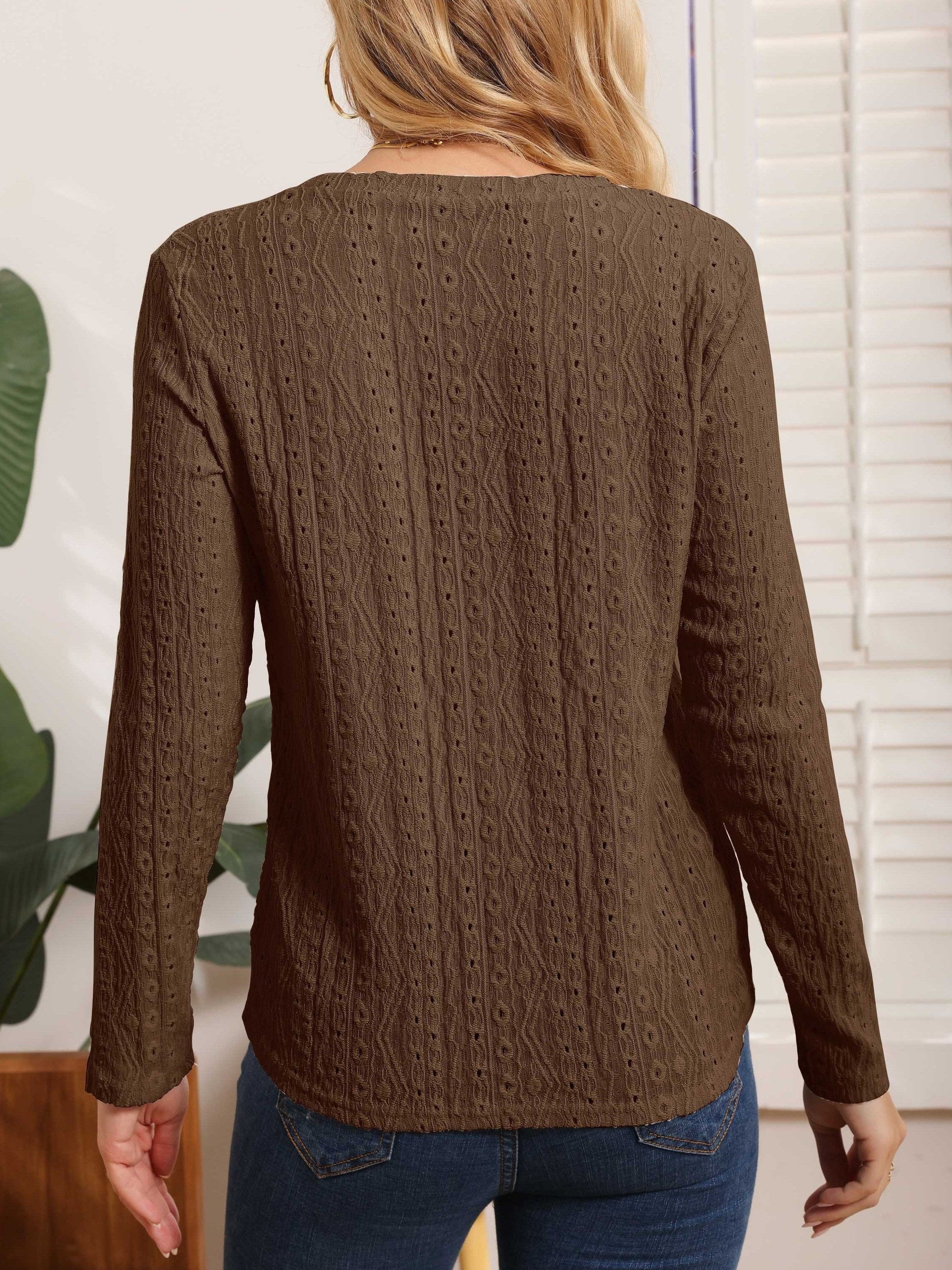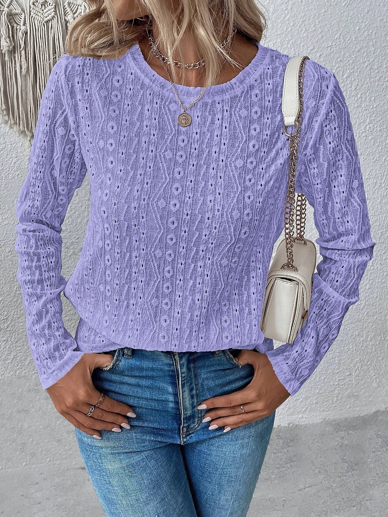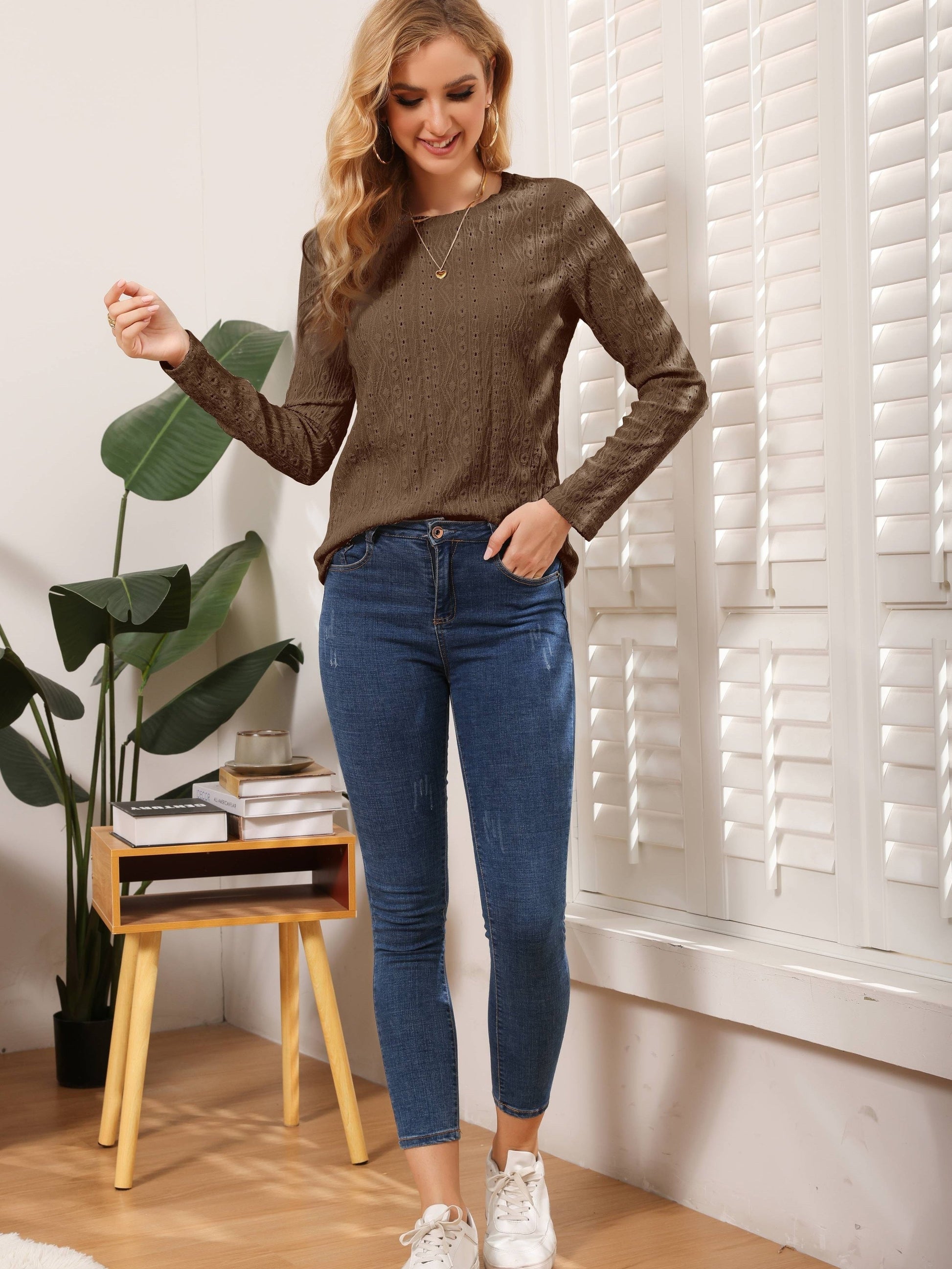 Eyelet Solid T-shirt, Casual Crew Neck Long Sleeve T-shirt