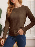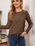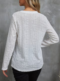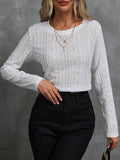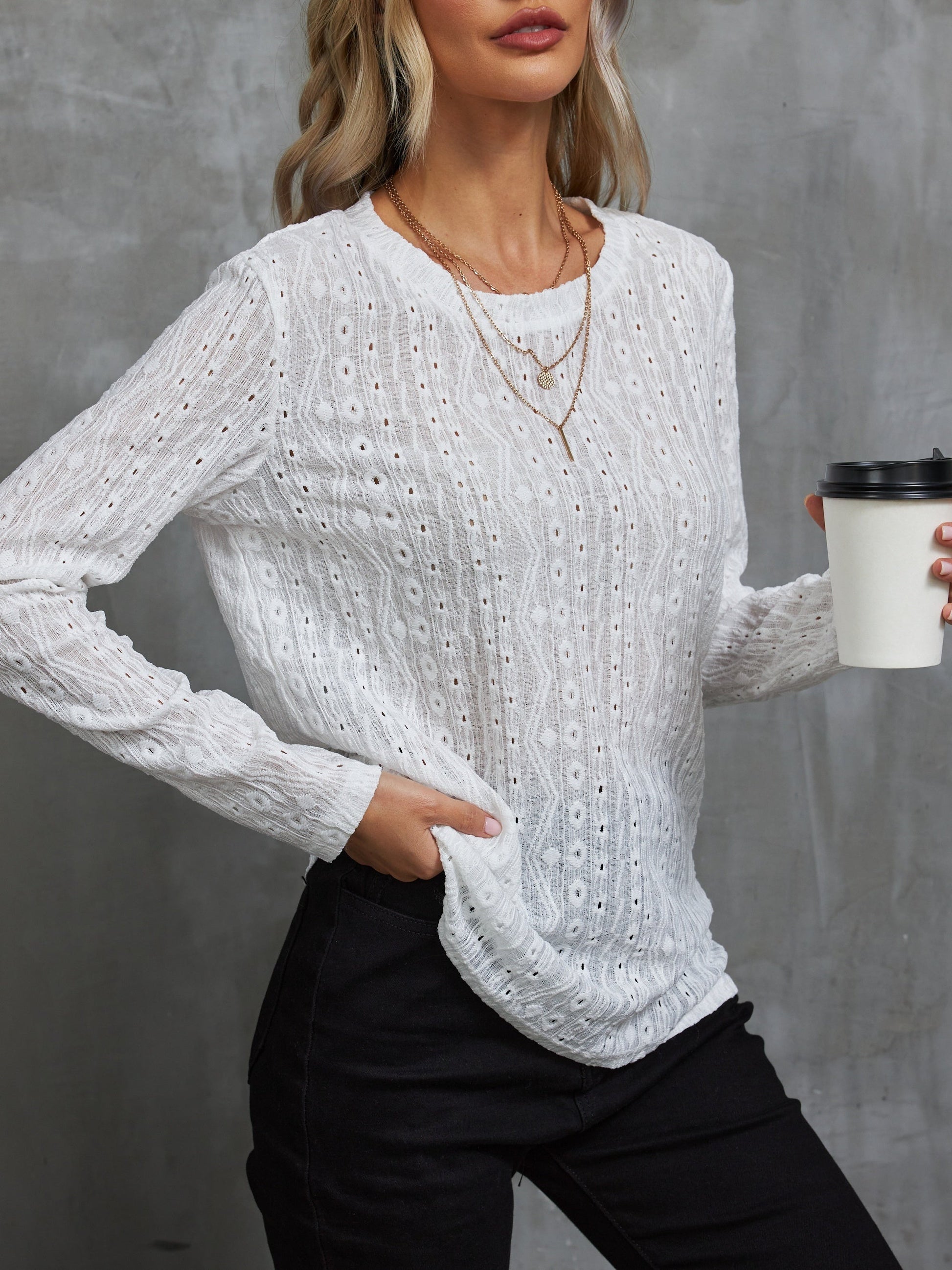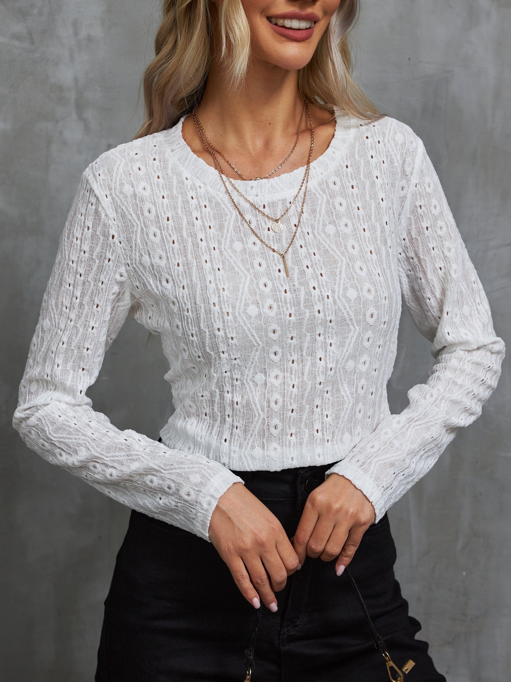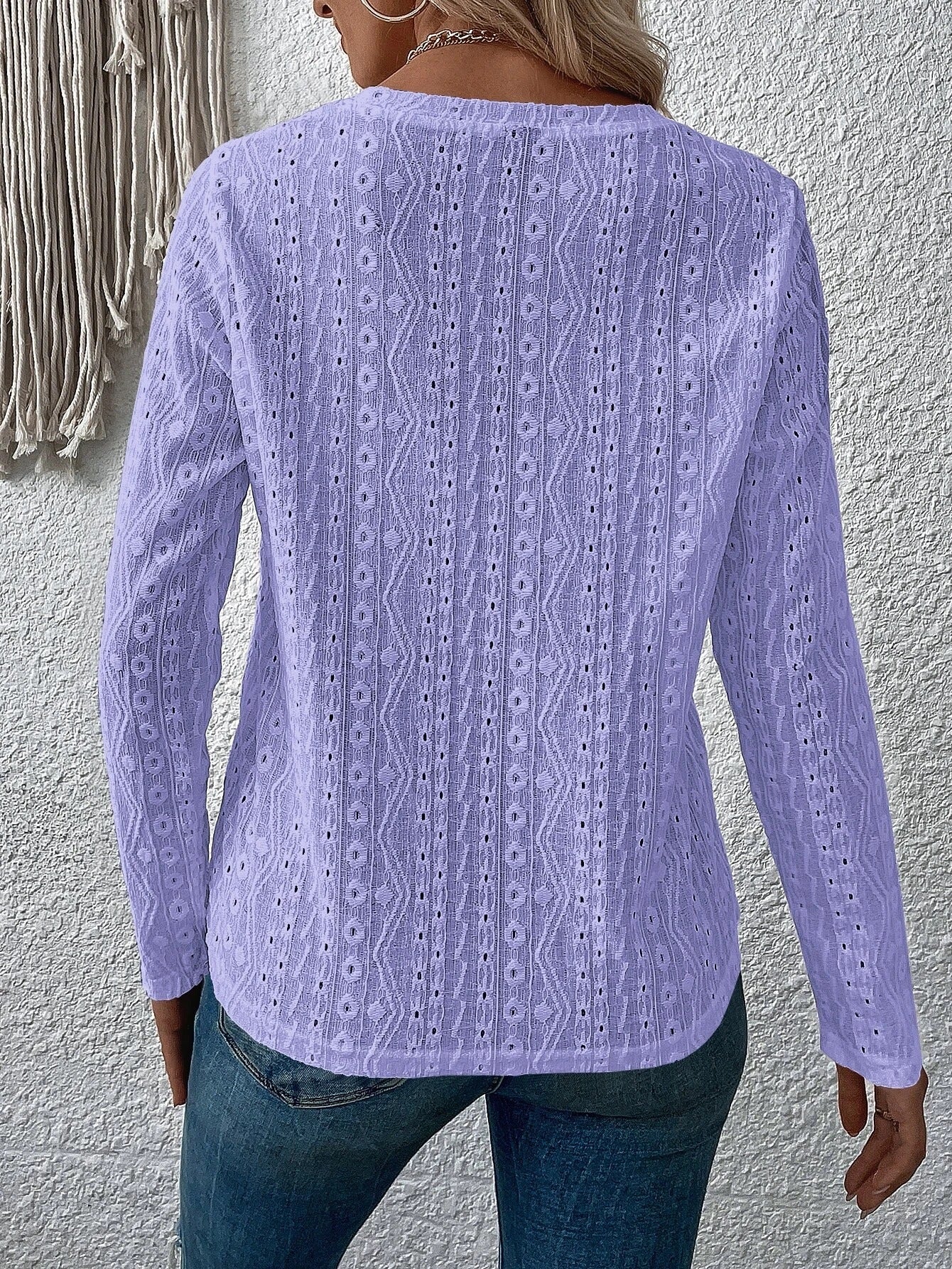Eyelet Solid T-shirt, Casual Crew Neck Long Sleeve T-shirt