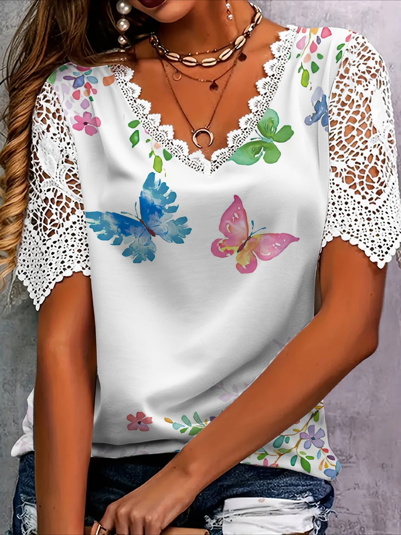 Fashionable Short Sleeve Elegant Lace Trim V-Neck T-Shirt