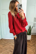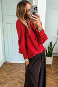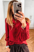 Fiery Red Frilled Trim Button Up Pleated Long Sleeve Shirt