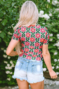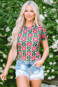 Sale Fiery Red Retro Floral Print Crew Neck T Shirt