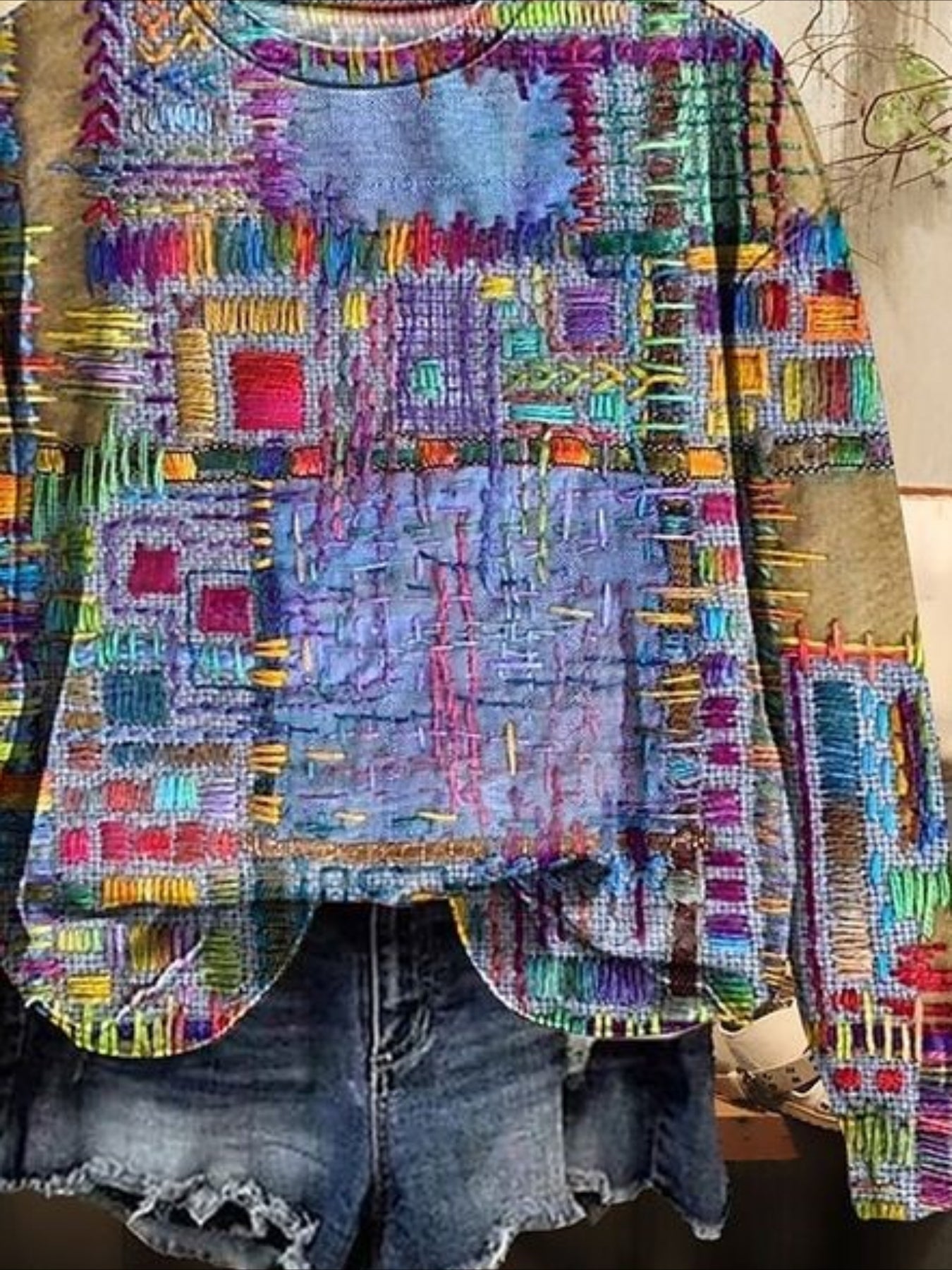 Denim Patchwork Print Casual Collared Long Sleeve Sweatshirt