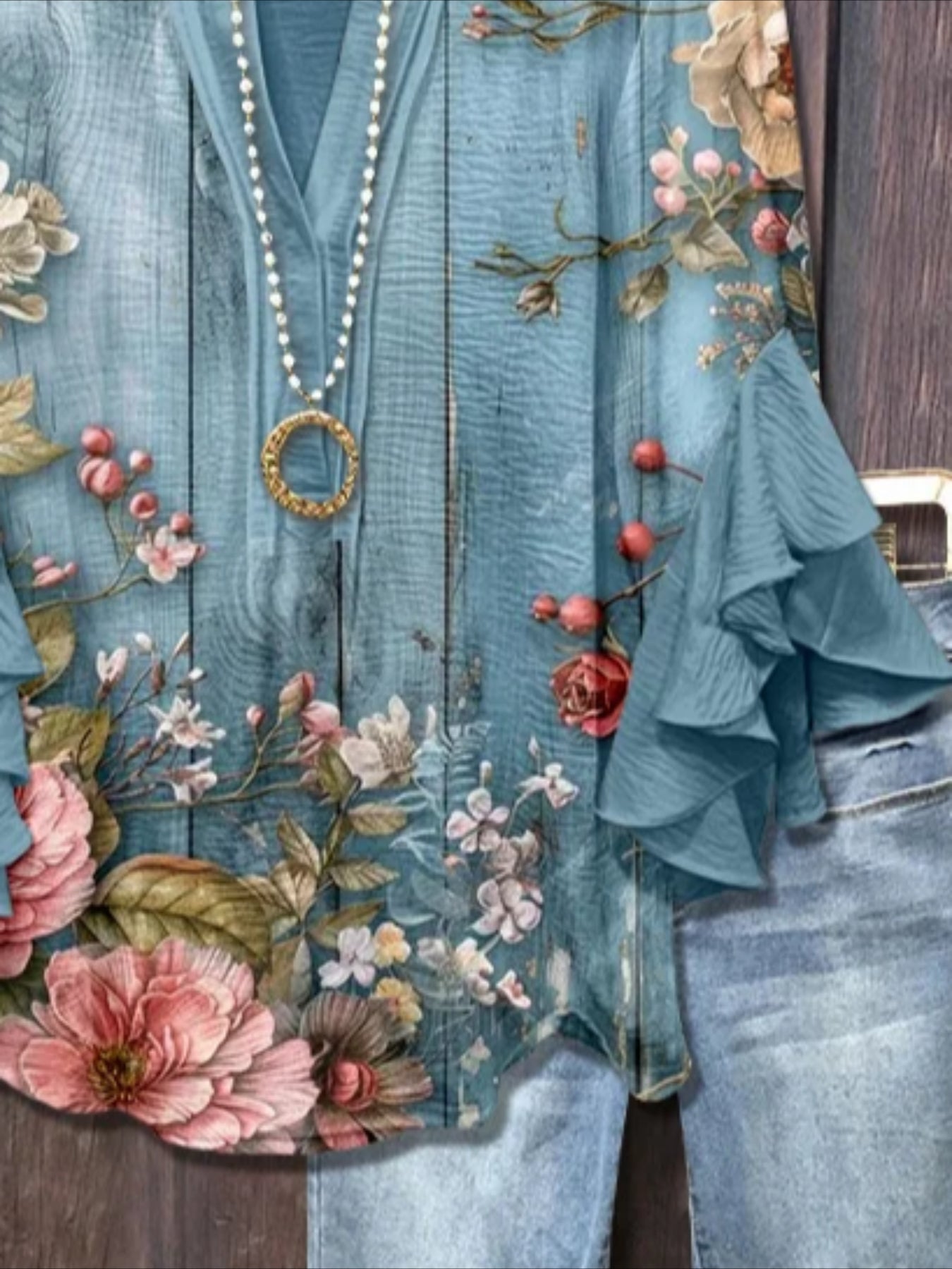 Floral Half Sleeve Shirt Summer Printing V Neck Daily Casual Top