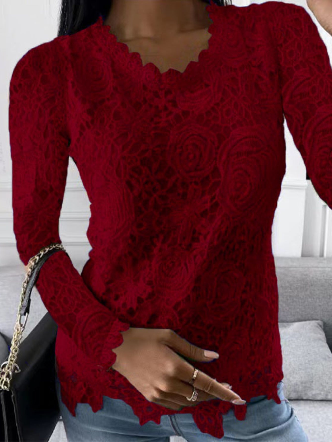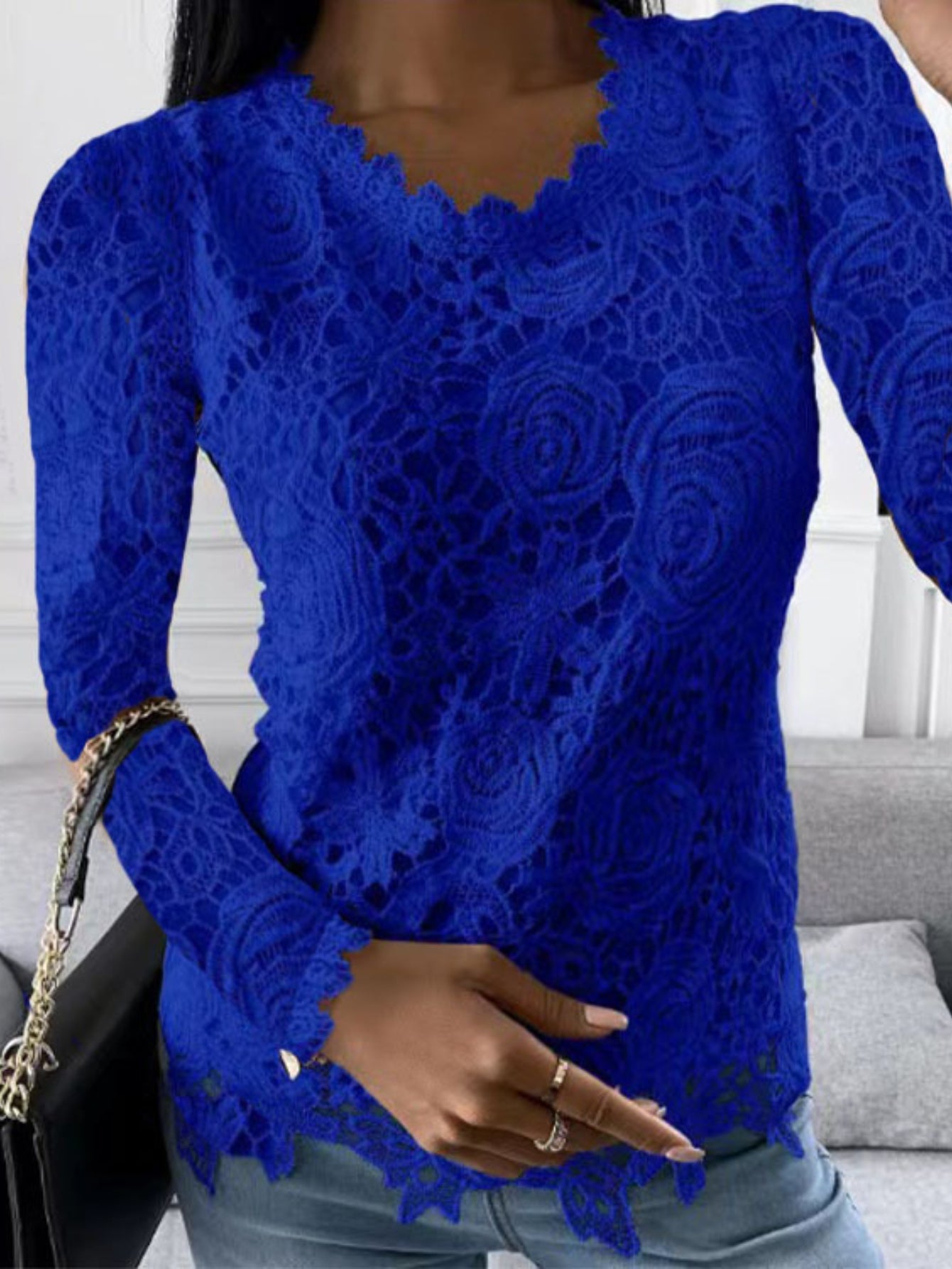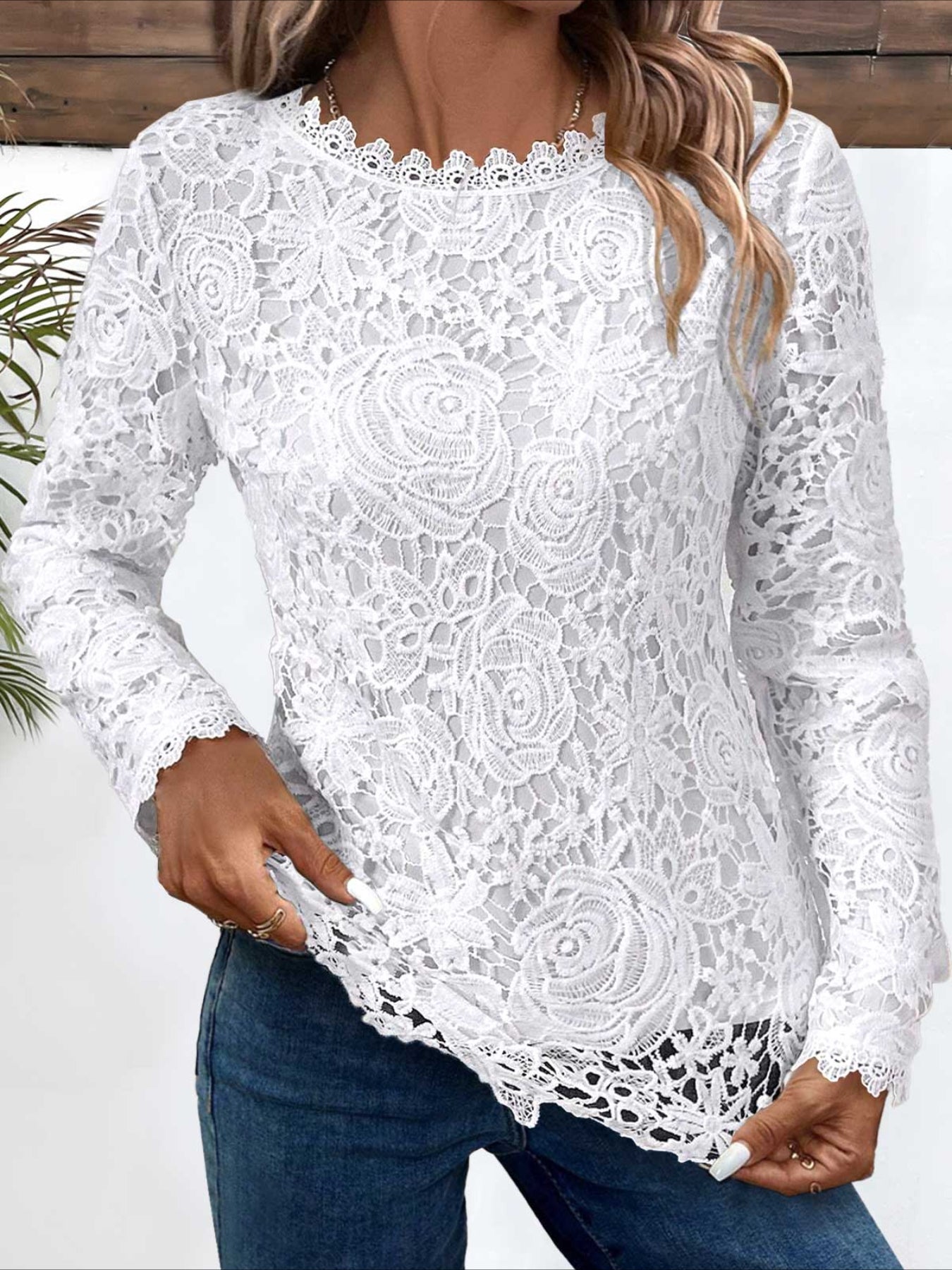 Sale Casual Contrast Lace Round Neck Long Sleeve T-Shirt