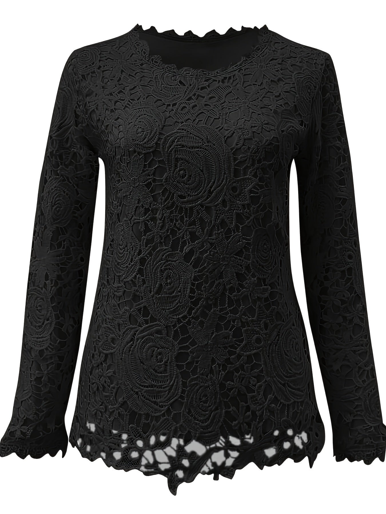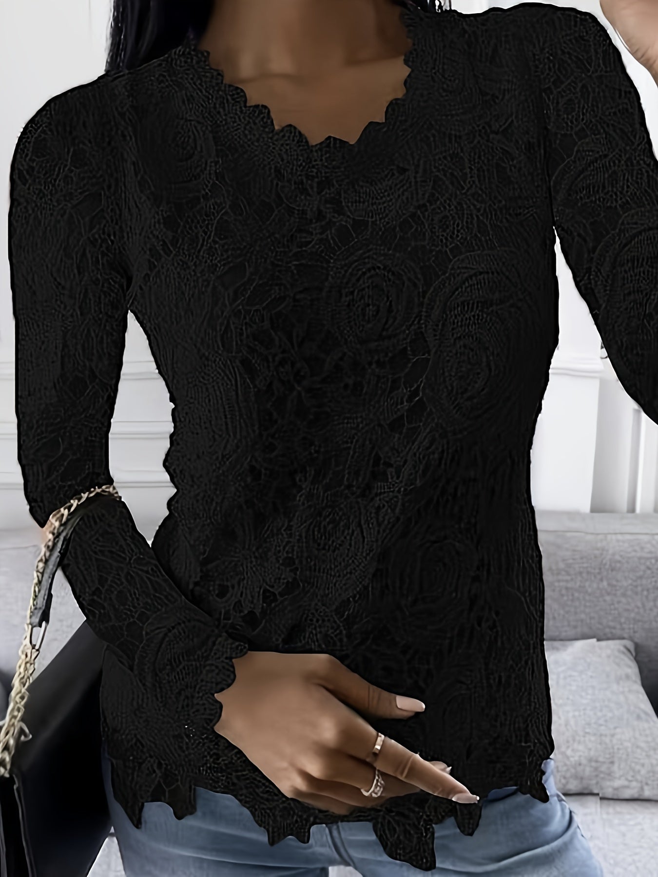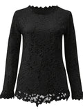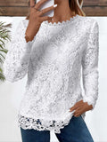 Sale Floral Lace Stitching Crew Neck T-Shirt, Casual Long Sleeve