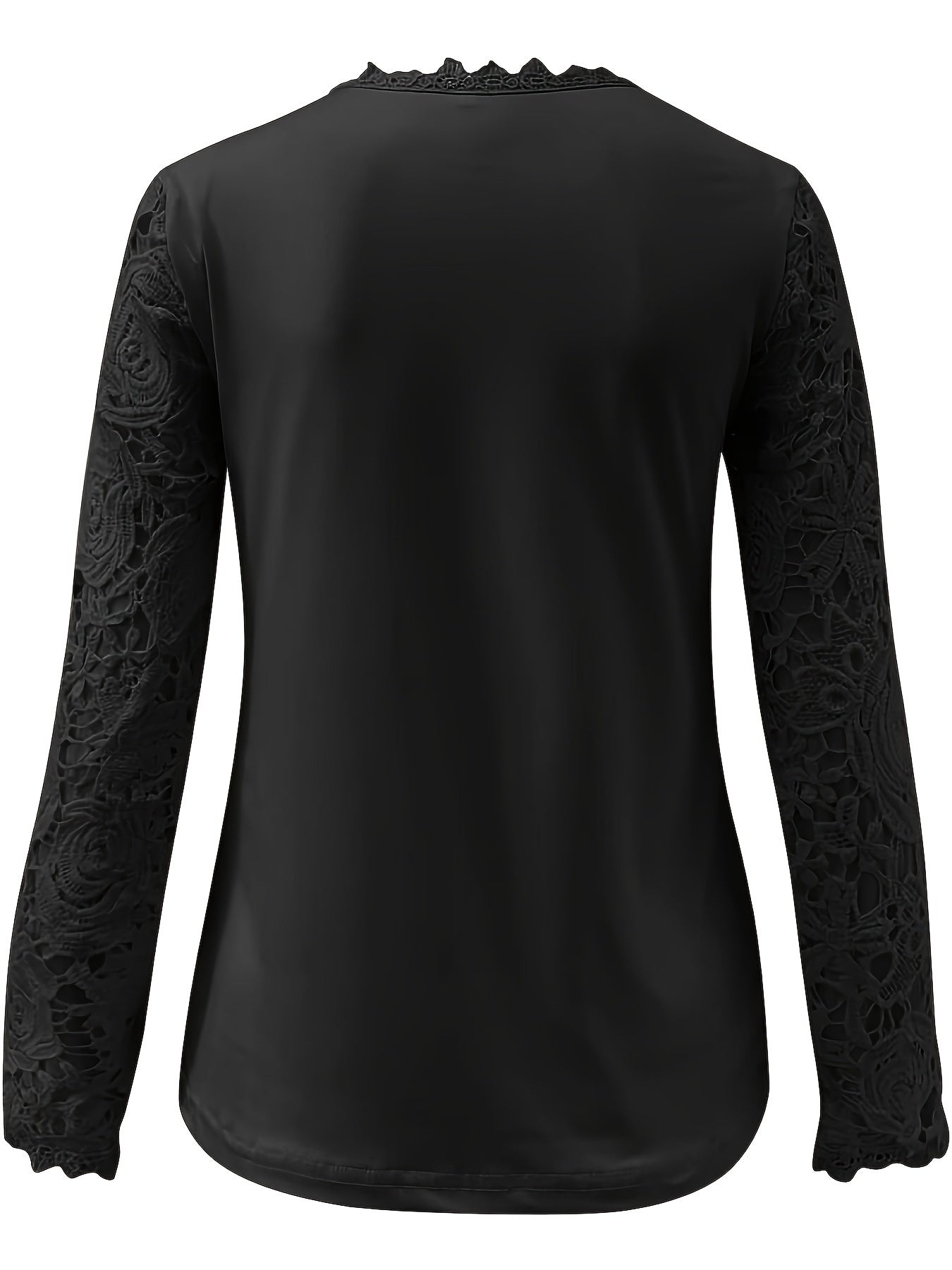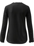 Sale Lace Splicing Swiss Dot V-neck Blouse, Elegant Long Sleeve Blouse Top