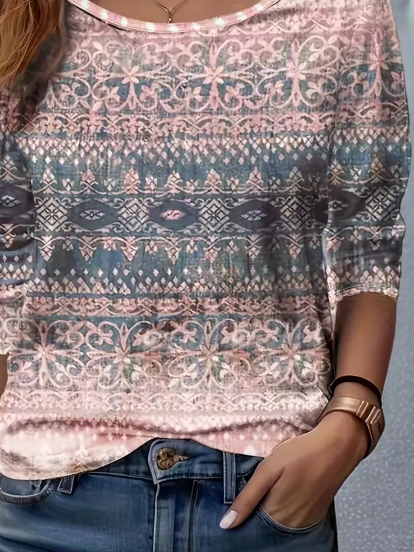 Sale Elegant Floral Print High-Stretch Round Neck Long Sleeve Top