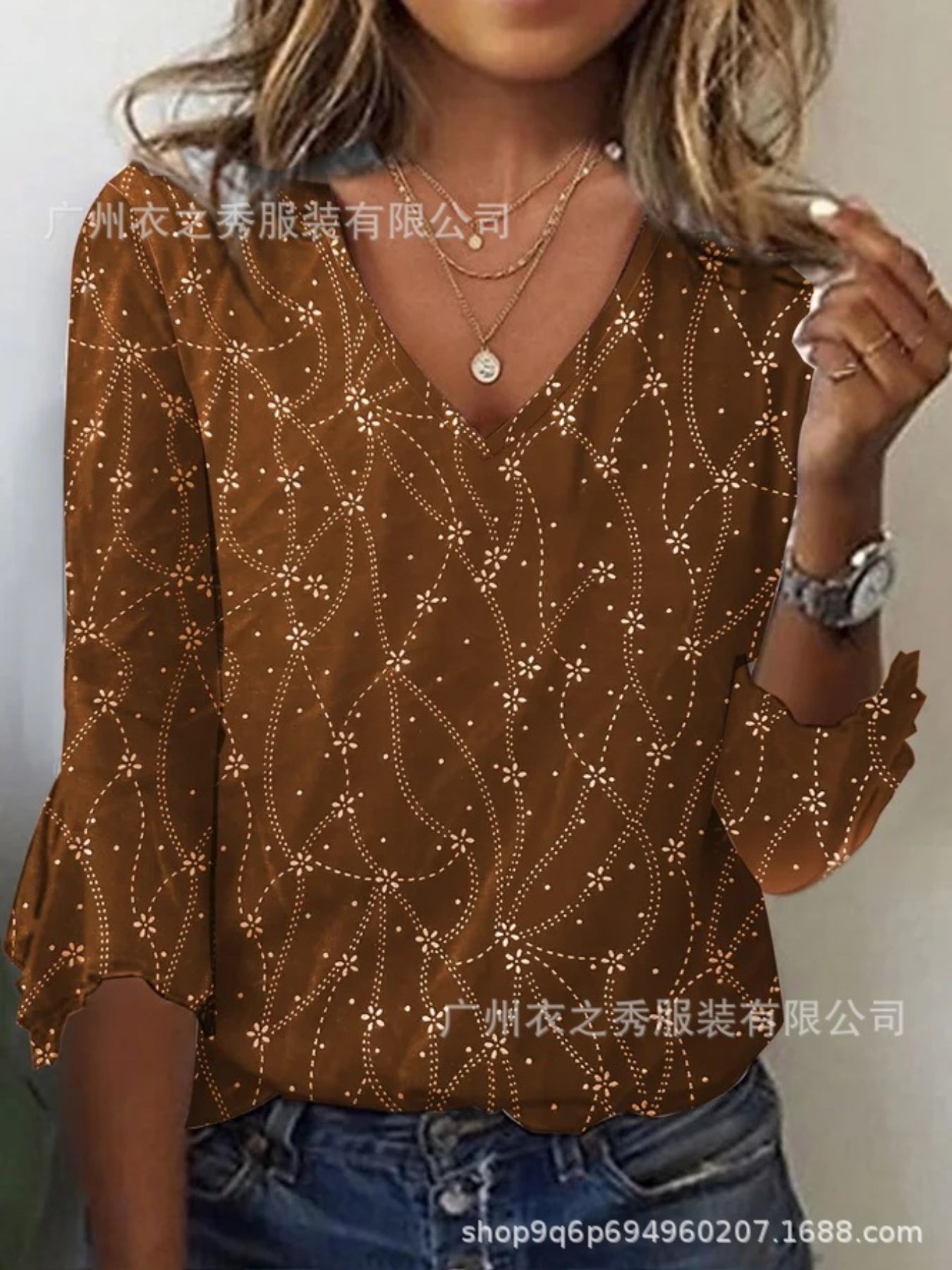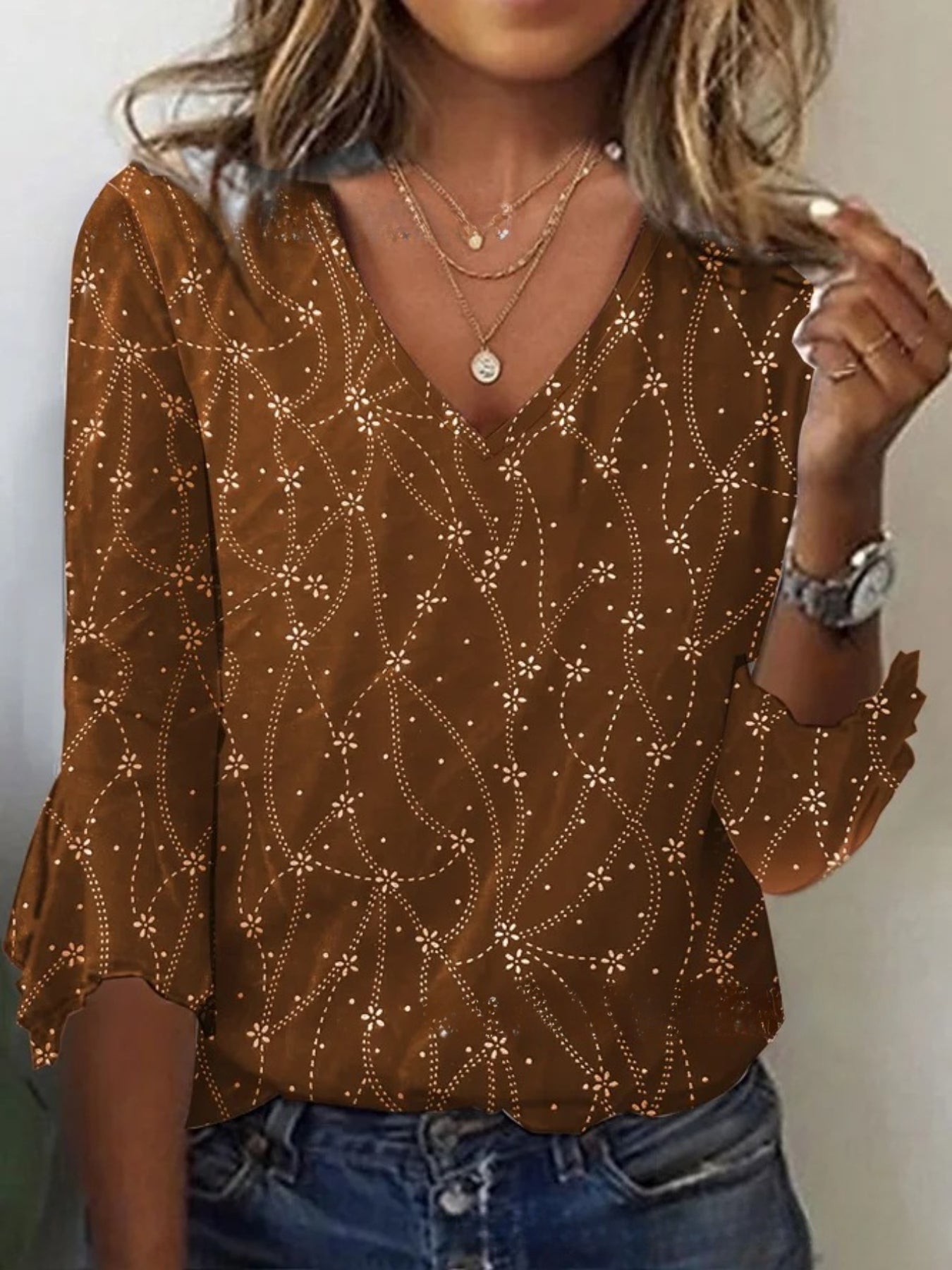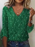 Sale V Neck Long Sleeve Geometric Regular Micro-Elasticity Regular Fit Blouse