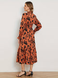 Sale Elegant Round Neck Flared Hem Long Sleeves Tiered Midi Dress