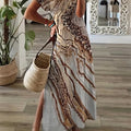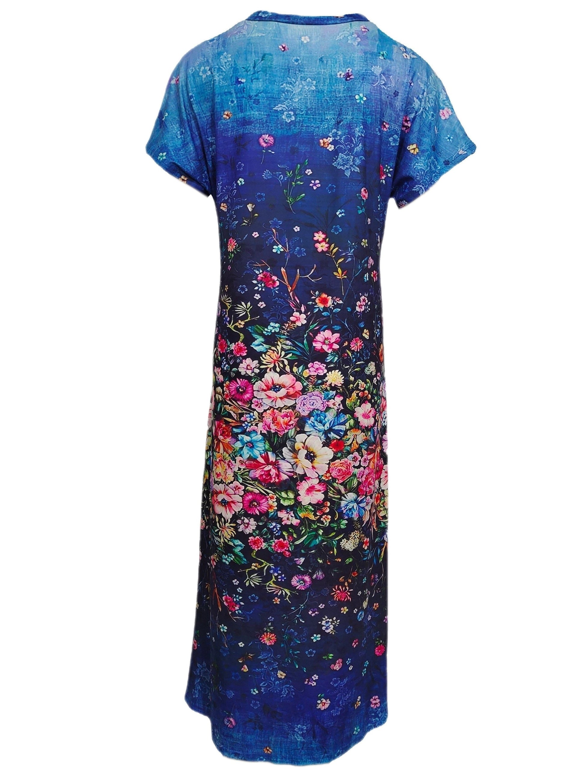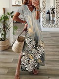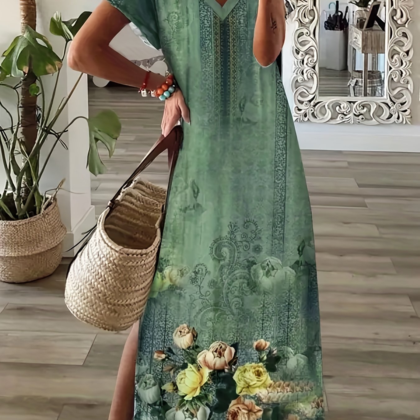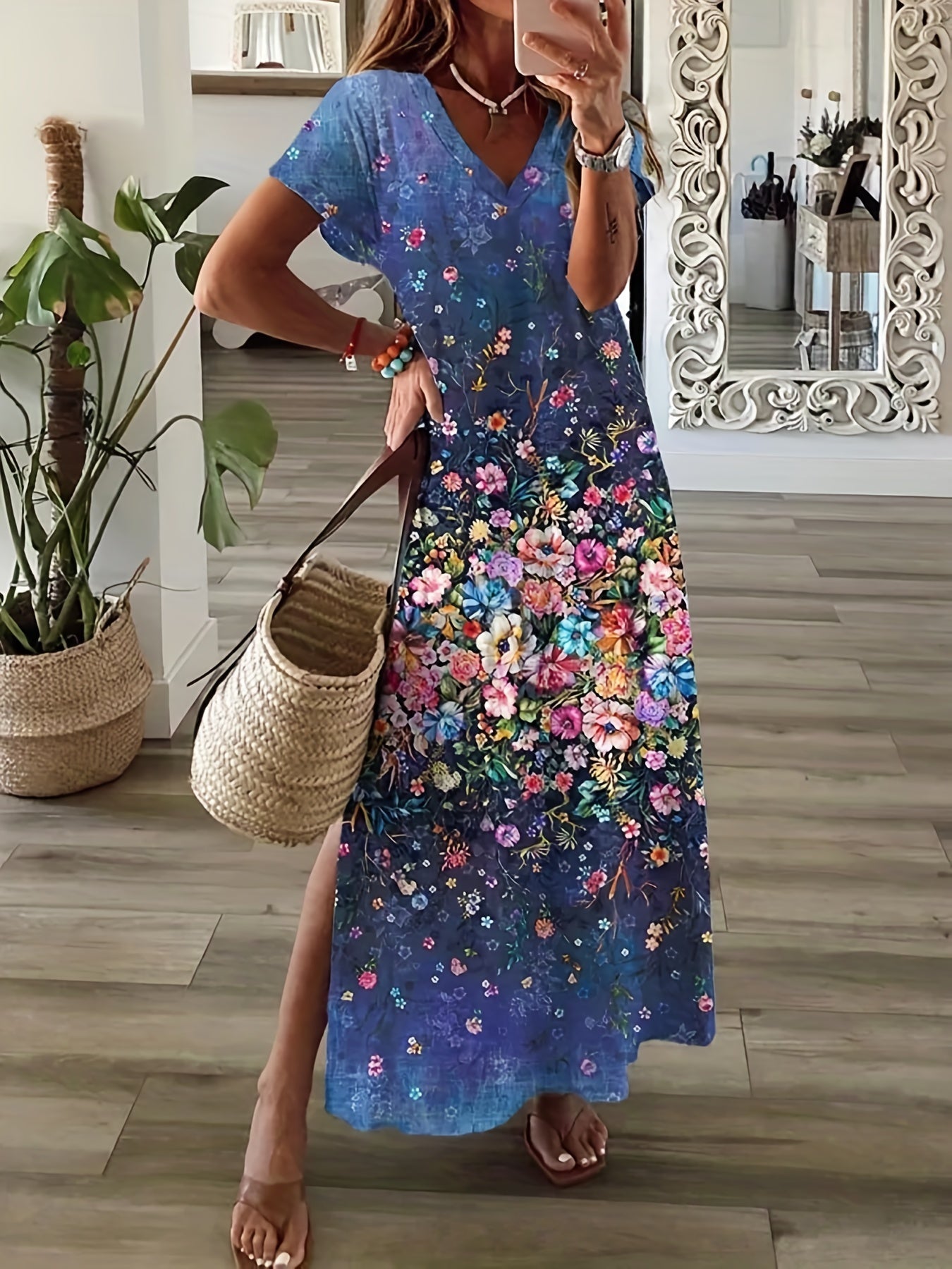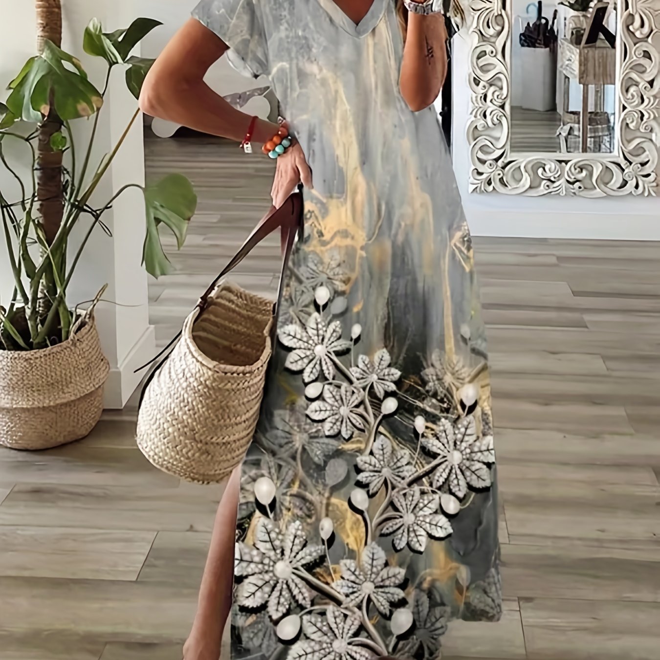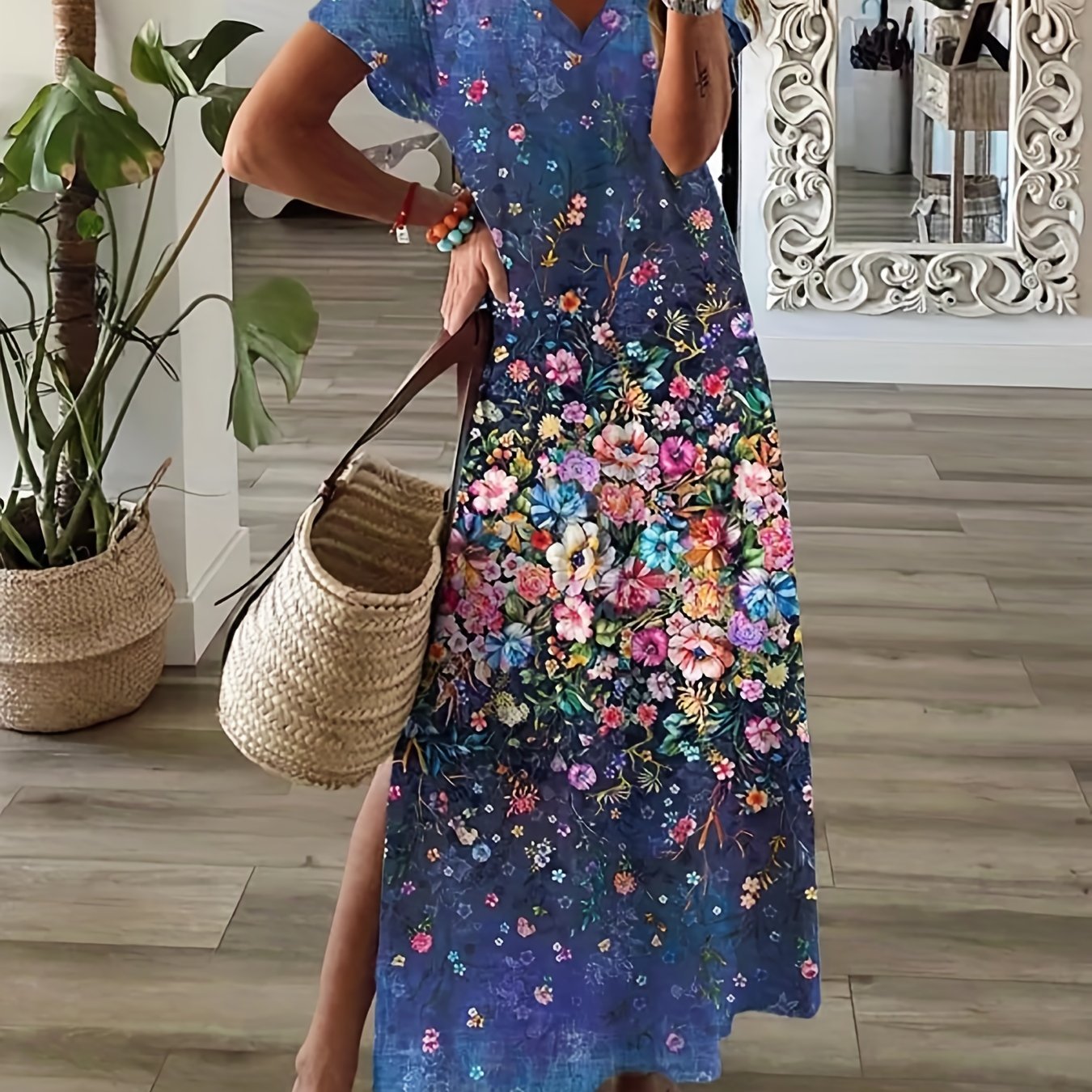 Floral Print Side Split Dress, Casual V Neck Short Sleeve Dress, Women's Clothing
