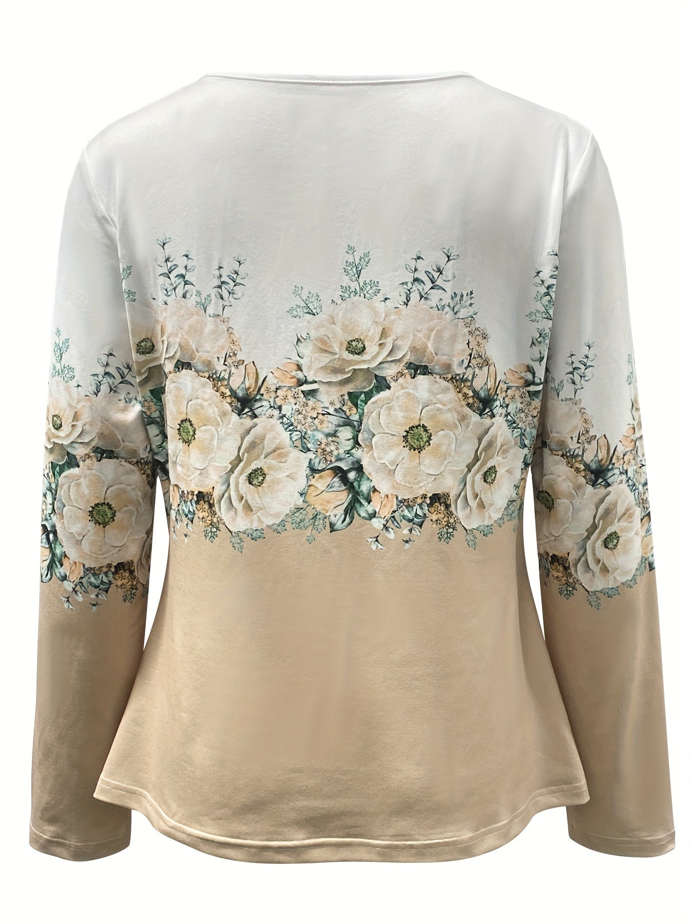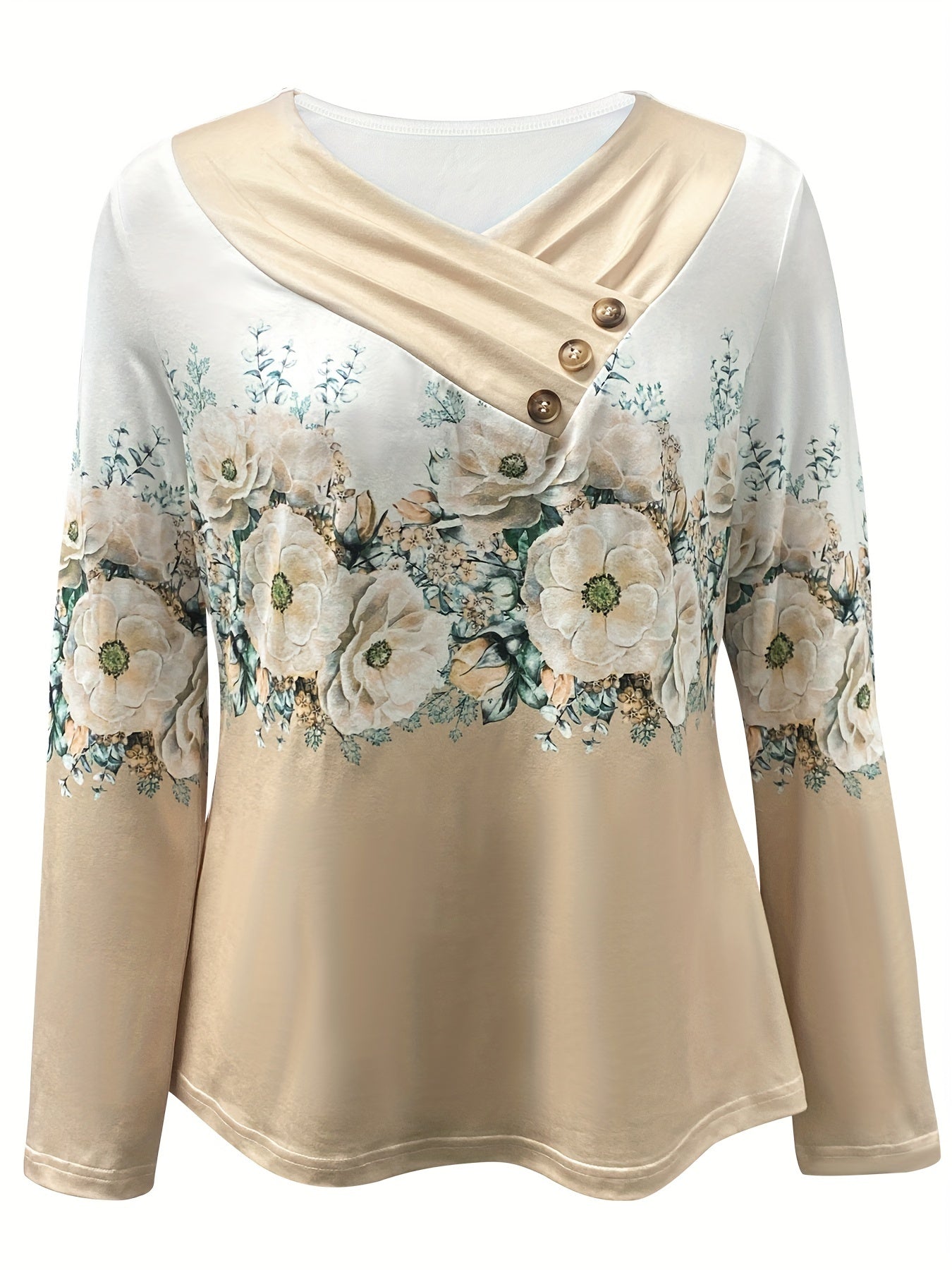 Floral Print Surplice Neck Button T-Shirt, Casual Long Sleeve T-Shirt