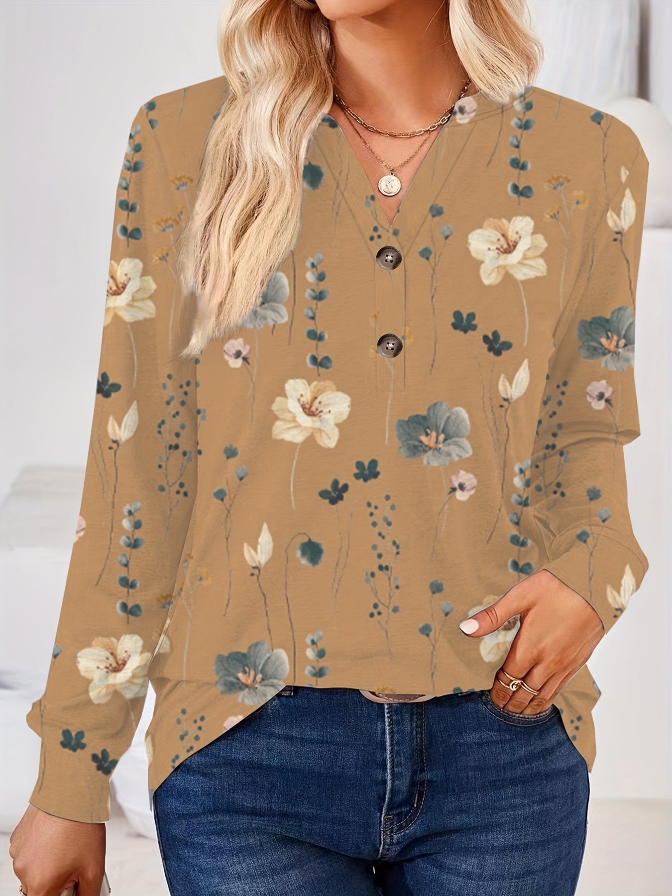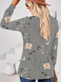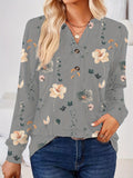 Floral Print V Neck Button T-Shirt, Casual Long Sleeve T-Shirt