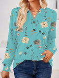 Sale Floral Print V Neck Button T-Shirt, Casual Long Sleeve T-Shirt