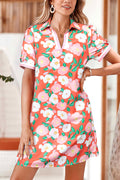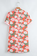 Sale Fresh Salmon Floral Print Contrast Striped Trim Polo Collar T Shirt Dress