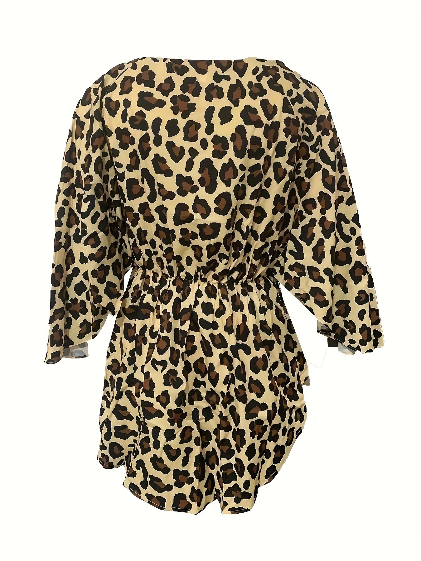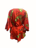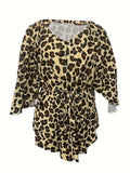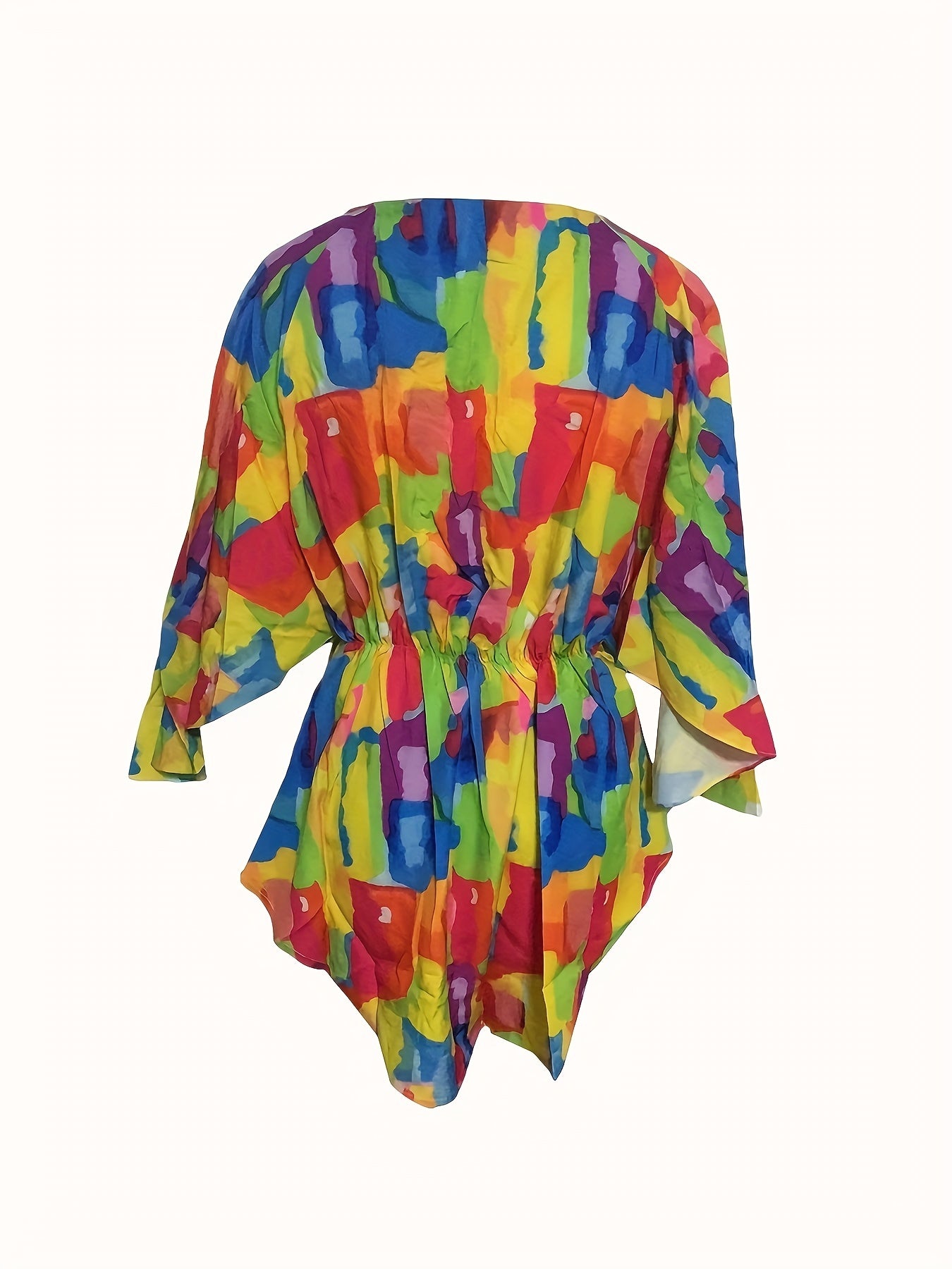 Full Printed V Neck Dress, Casual Tie Waist Batwing Sleeve Dress