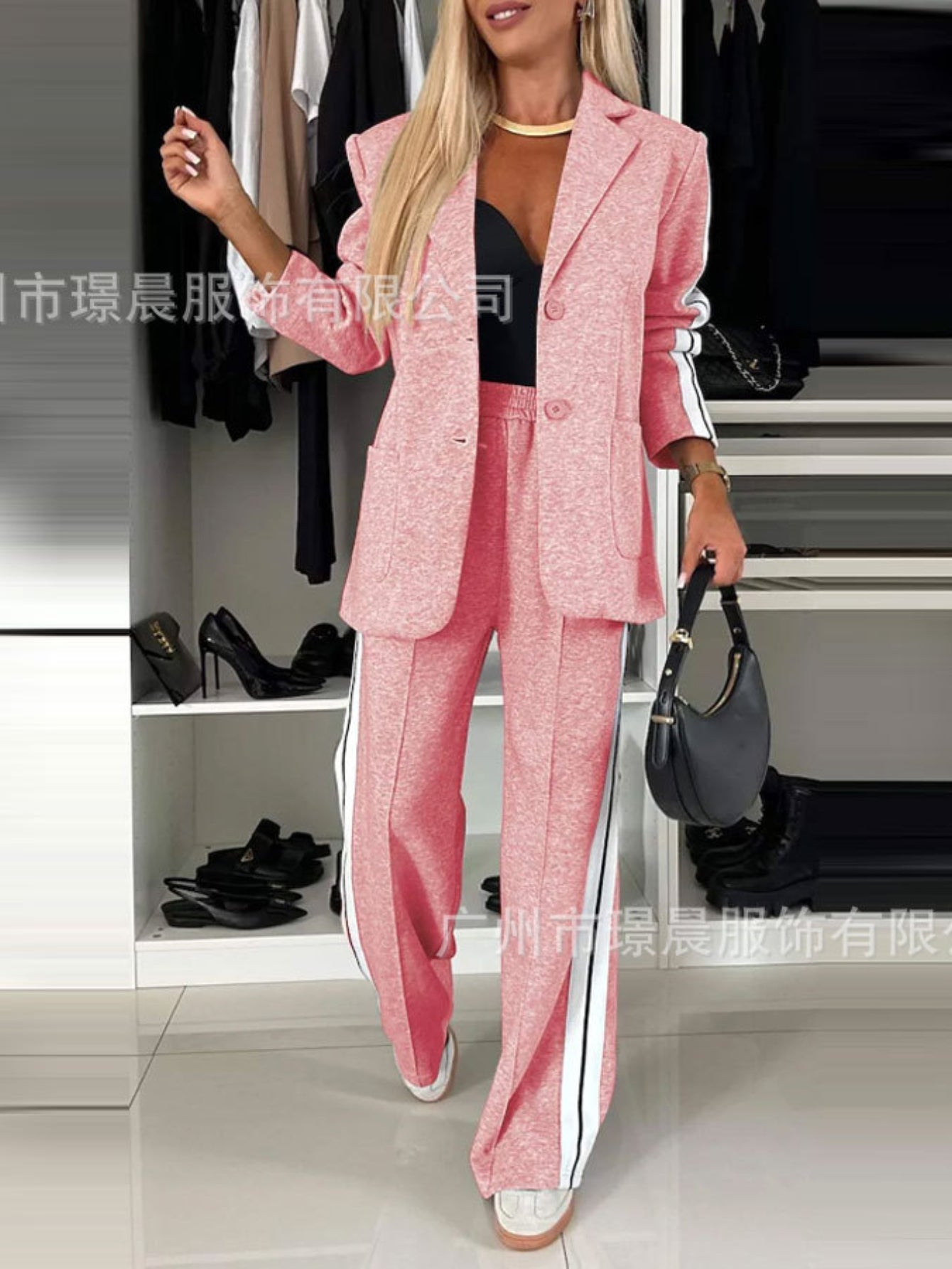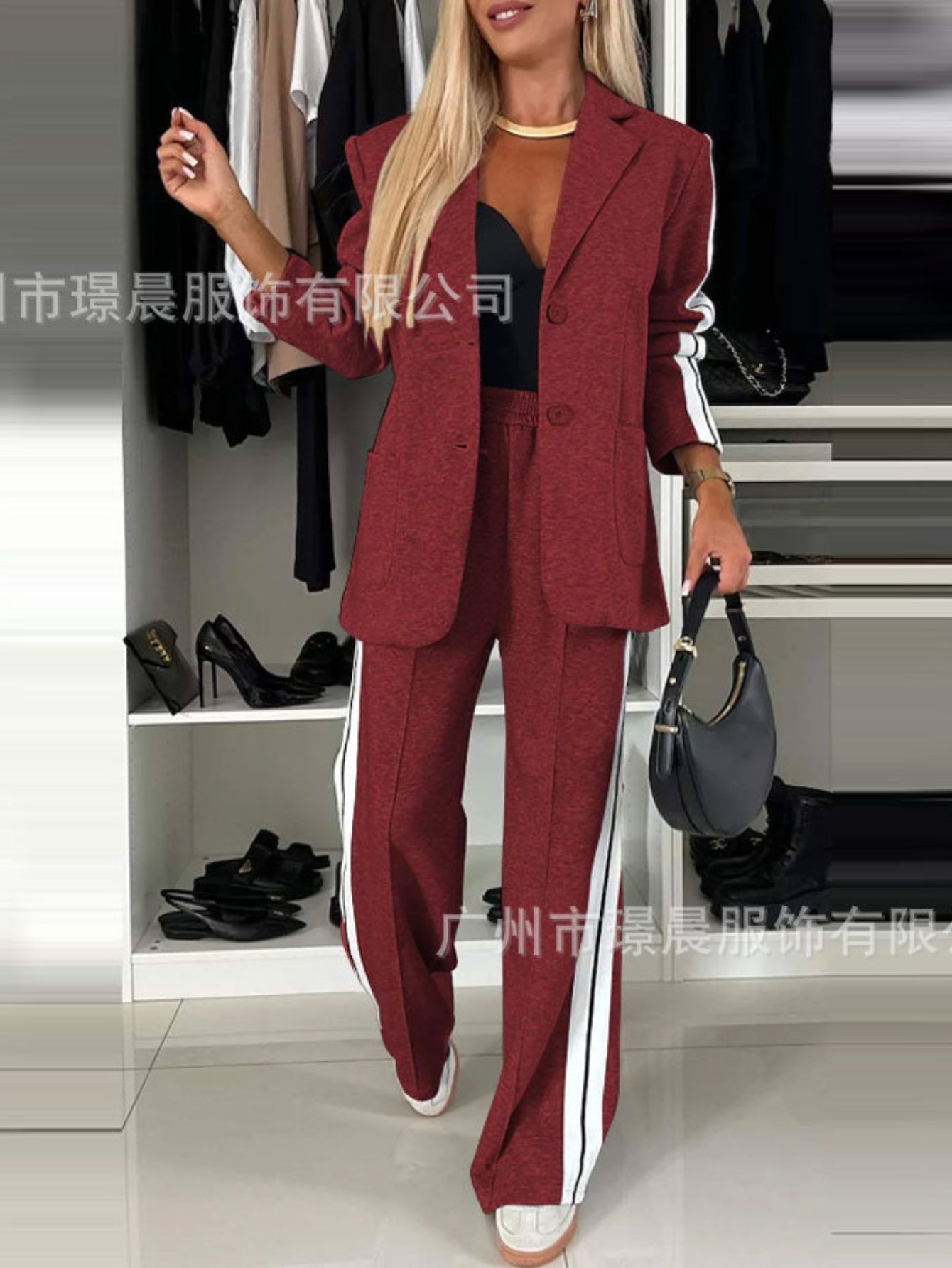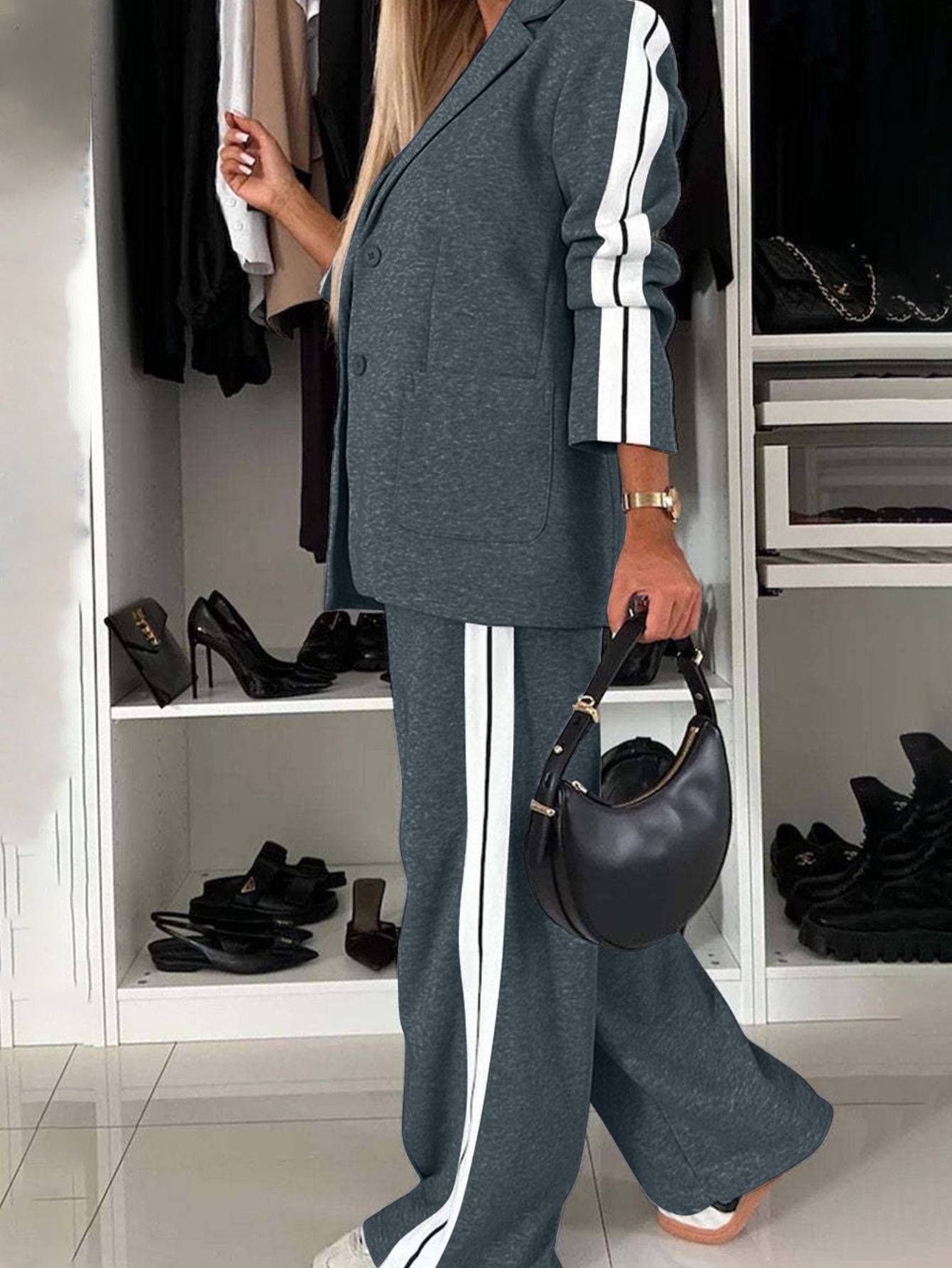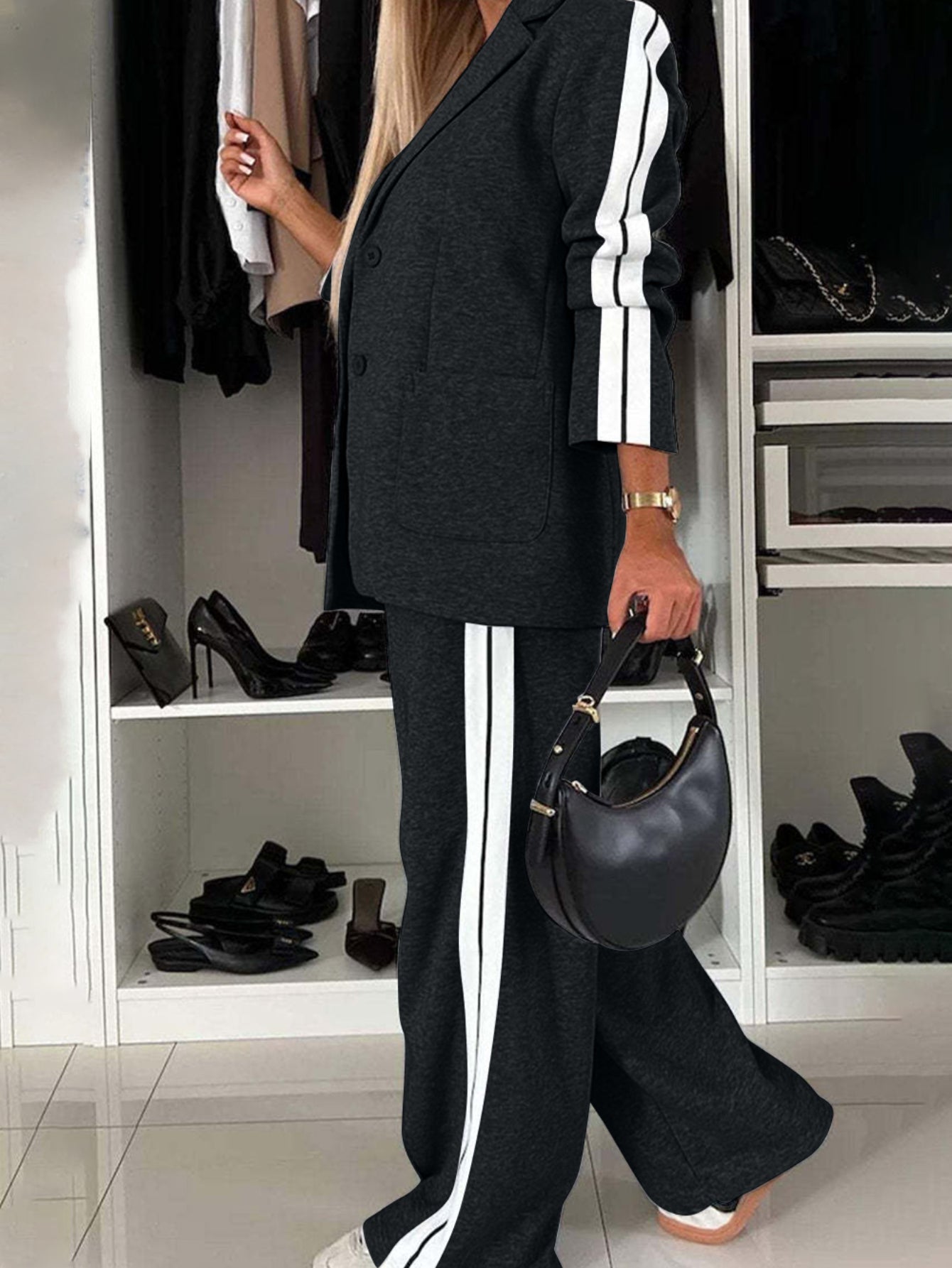 Sale Full Size Contrast Lapel Collar Top and Pants Set