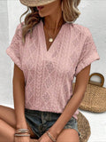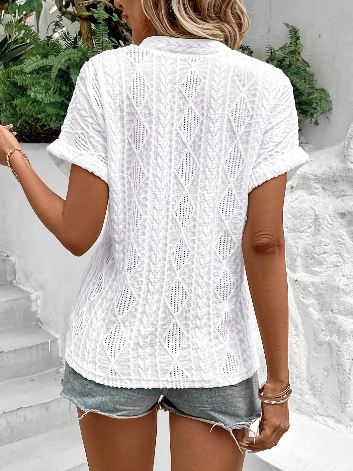 Geo Pattern Notched Neck T-Shirt, Elegant Short Sleeve Textured T-Shirt