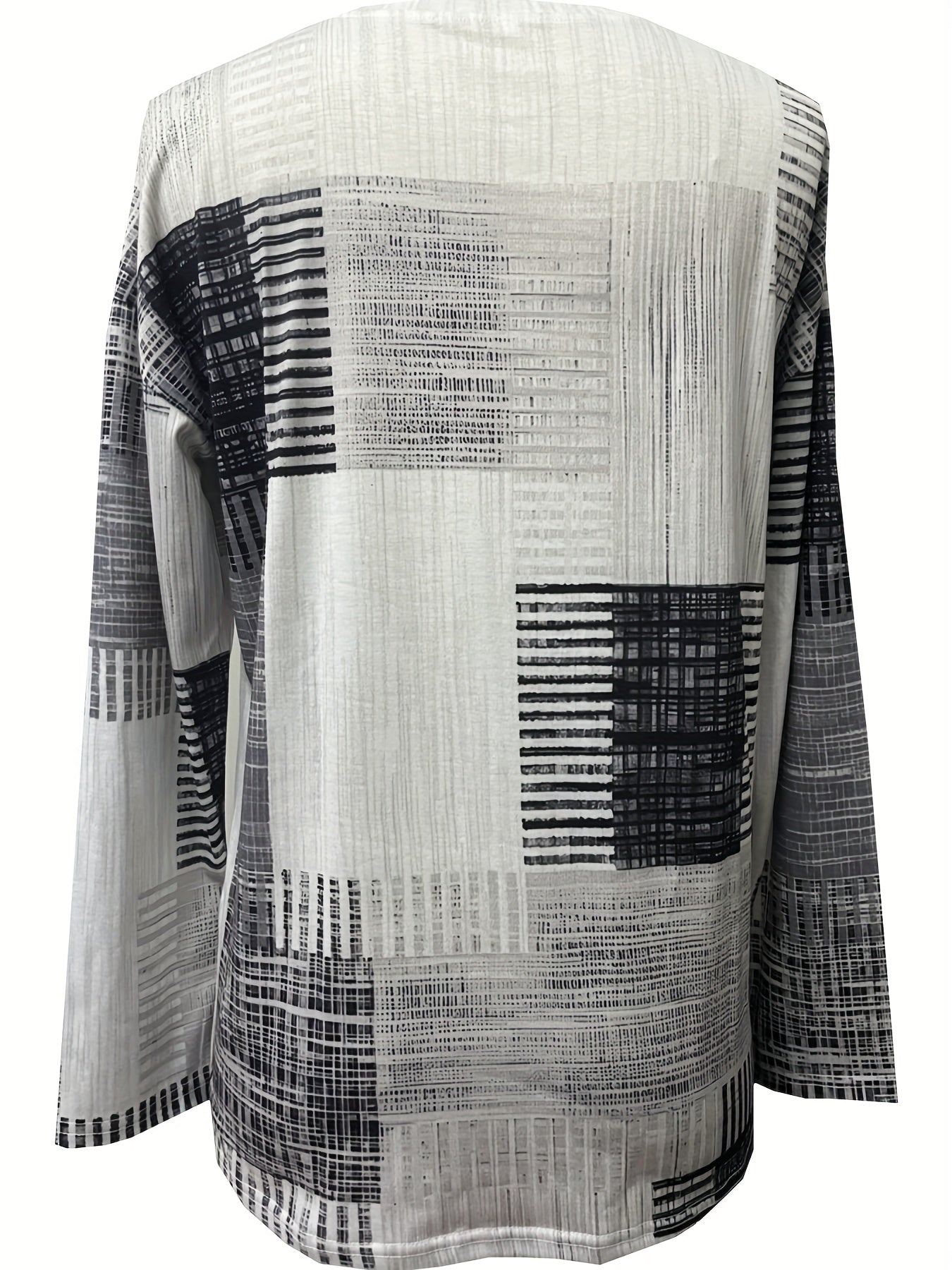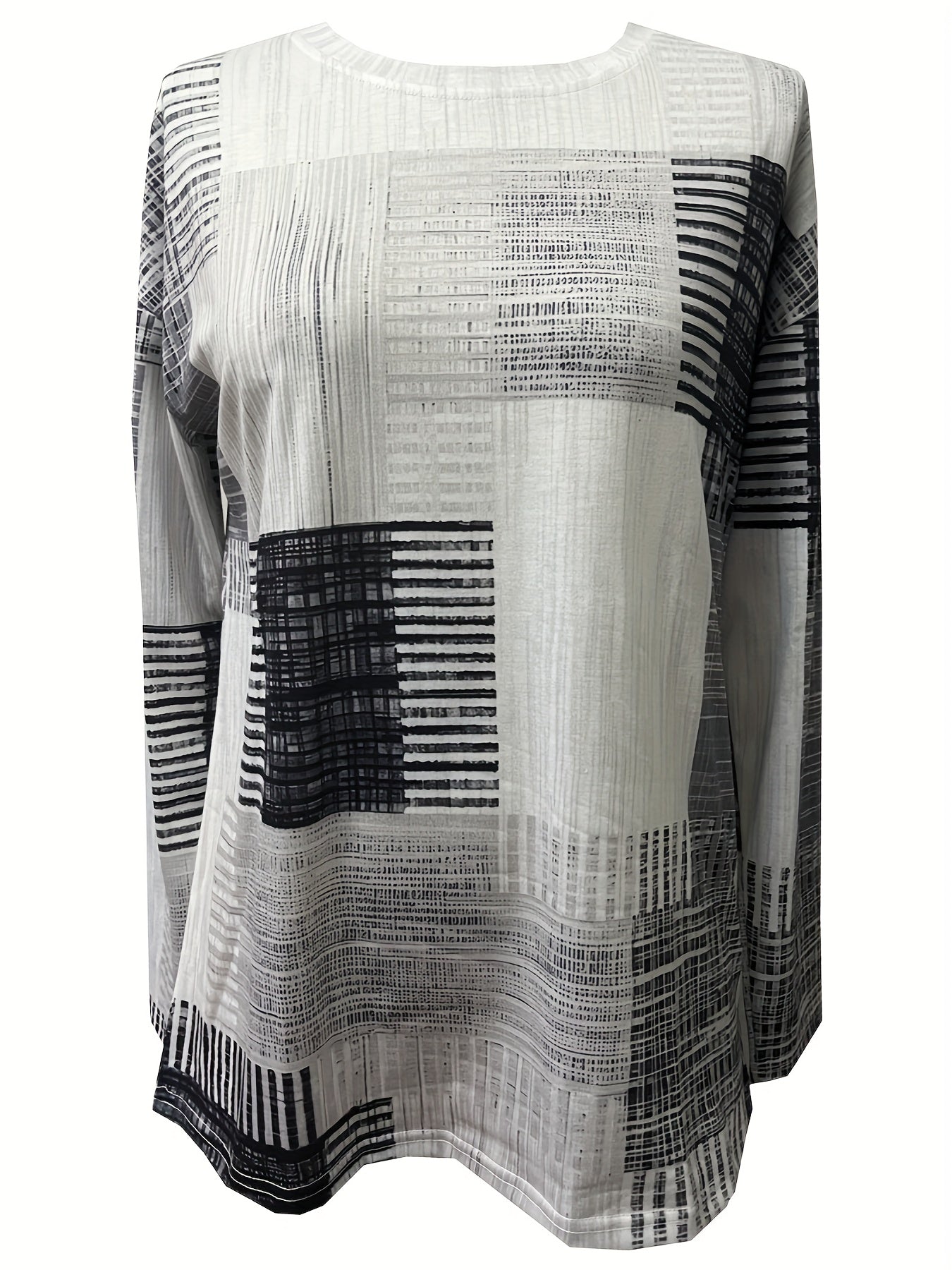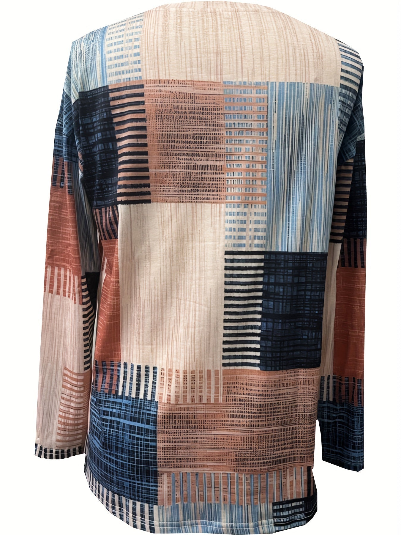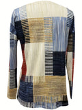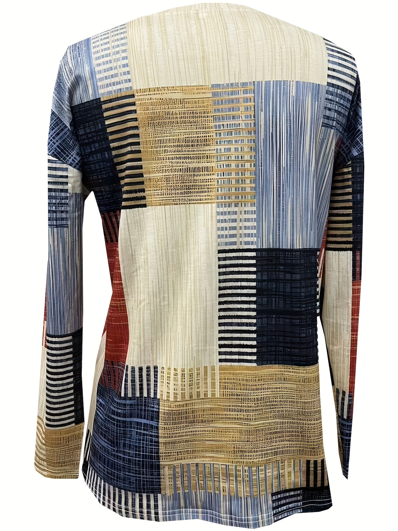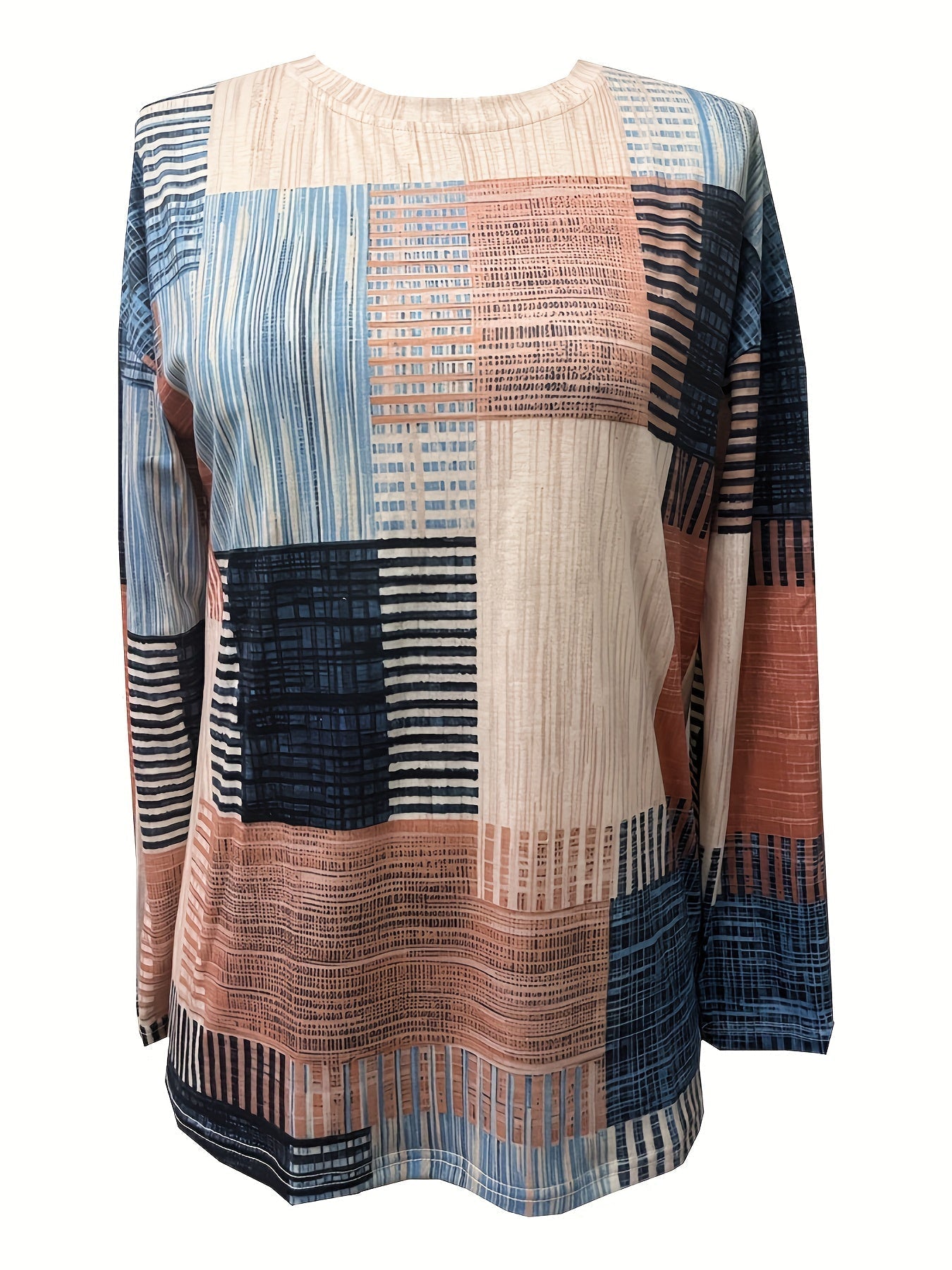 Geometric Print Crew Neck T-Shirt, Casual Color Block Long Sleeve T-Shirt