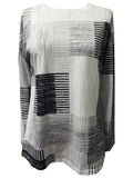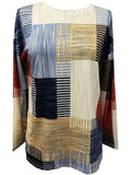 Sale Geometric Print Crew Neck T-Shirt, Casual Color Block Long Sleeve T-Shirt