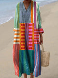 Graphic Geometric Stripe Long Sleeve V Neck Crew Neck Pullover Midi Dress