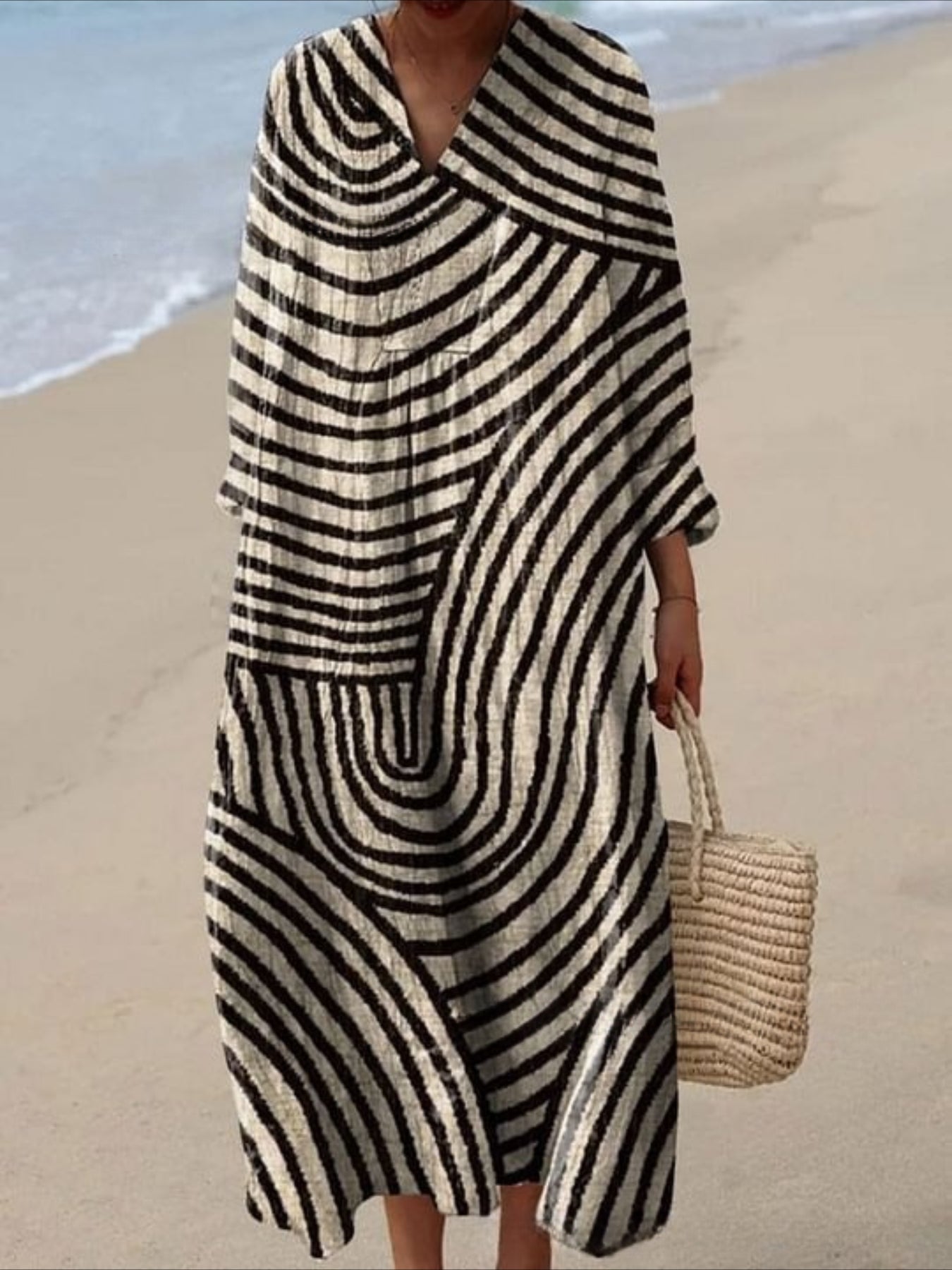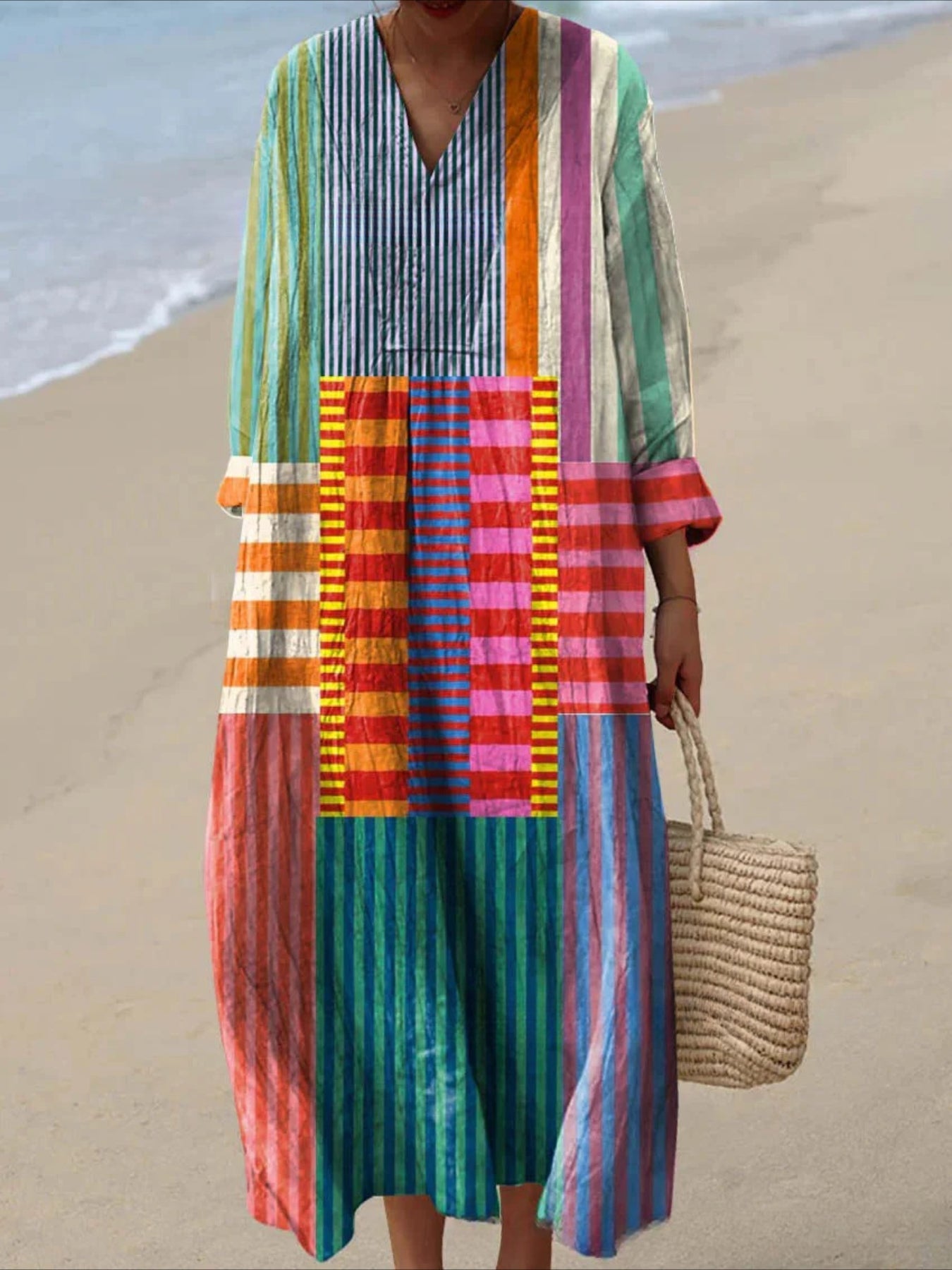 Sale Graphic Geometric Stripe Long Sleeve V Neck Crew Neck Pullover Midi Dress
