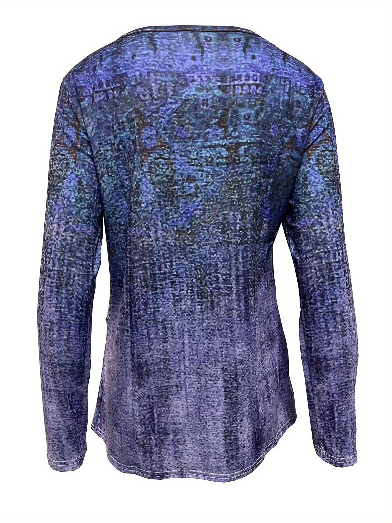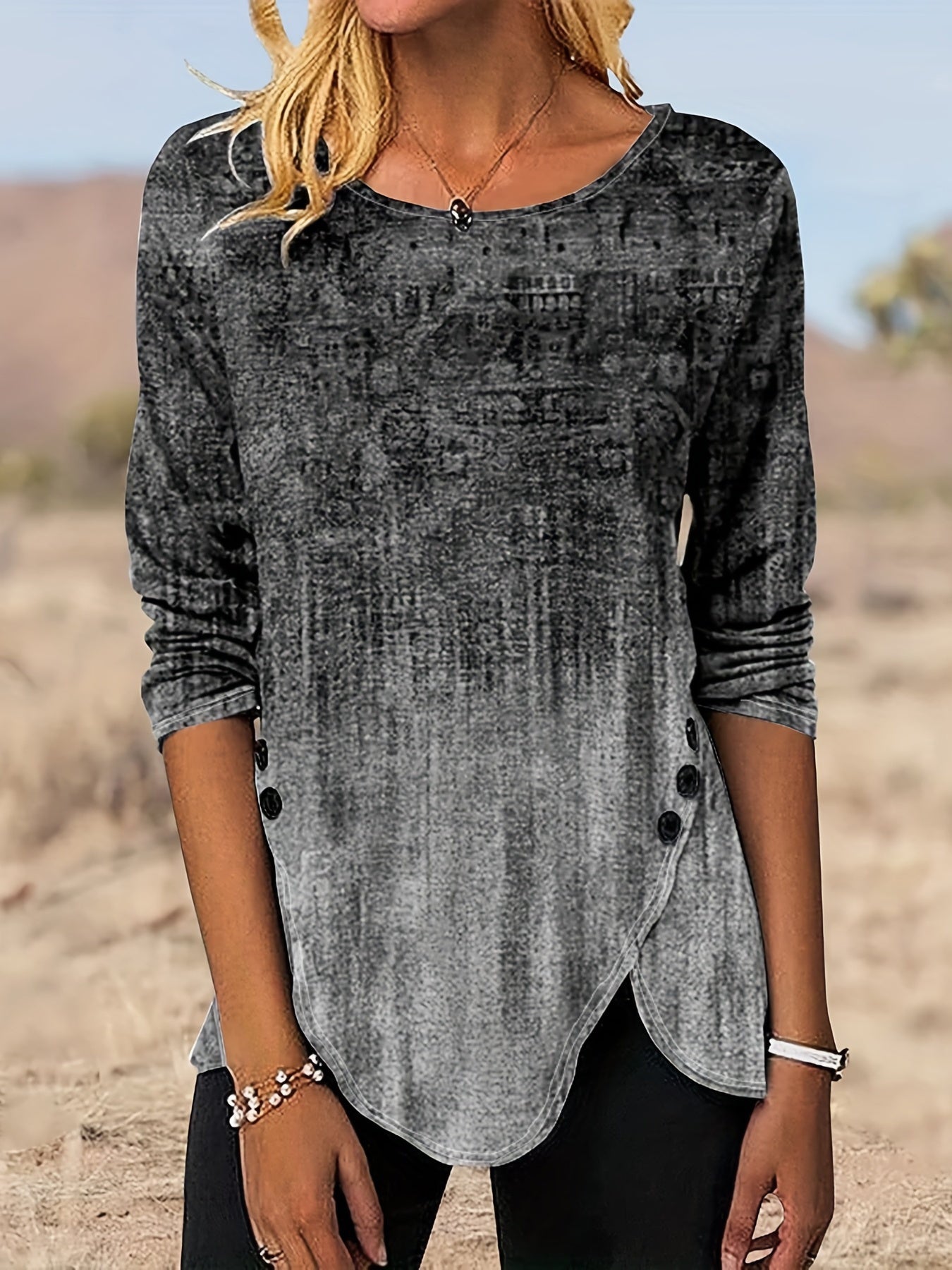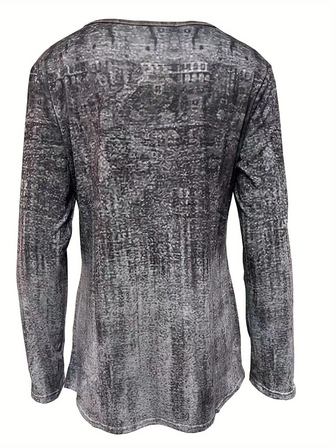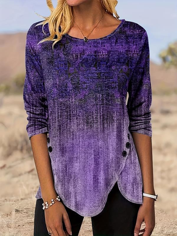 Sale Graphic Print Buttons Front T-Shirt, Casual Long Sleeve Asymmetrical Hem T-Shirt