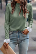 Grass Green Seam Detail Lace Contrast Cuffs Raglan Sleeve Top