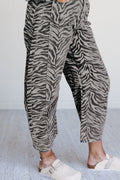 - A stylish zebra print on the soft, durable fabric.Barrel leg silhouette with a cropped ankle fit.Mid-rise waist with button and zip closure.Front and back pockets for laid-back functionality.Pairs effortlessly with knits, graphic tees, or flowy blouses.