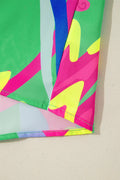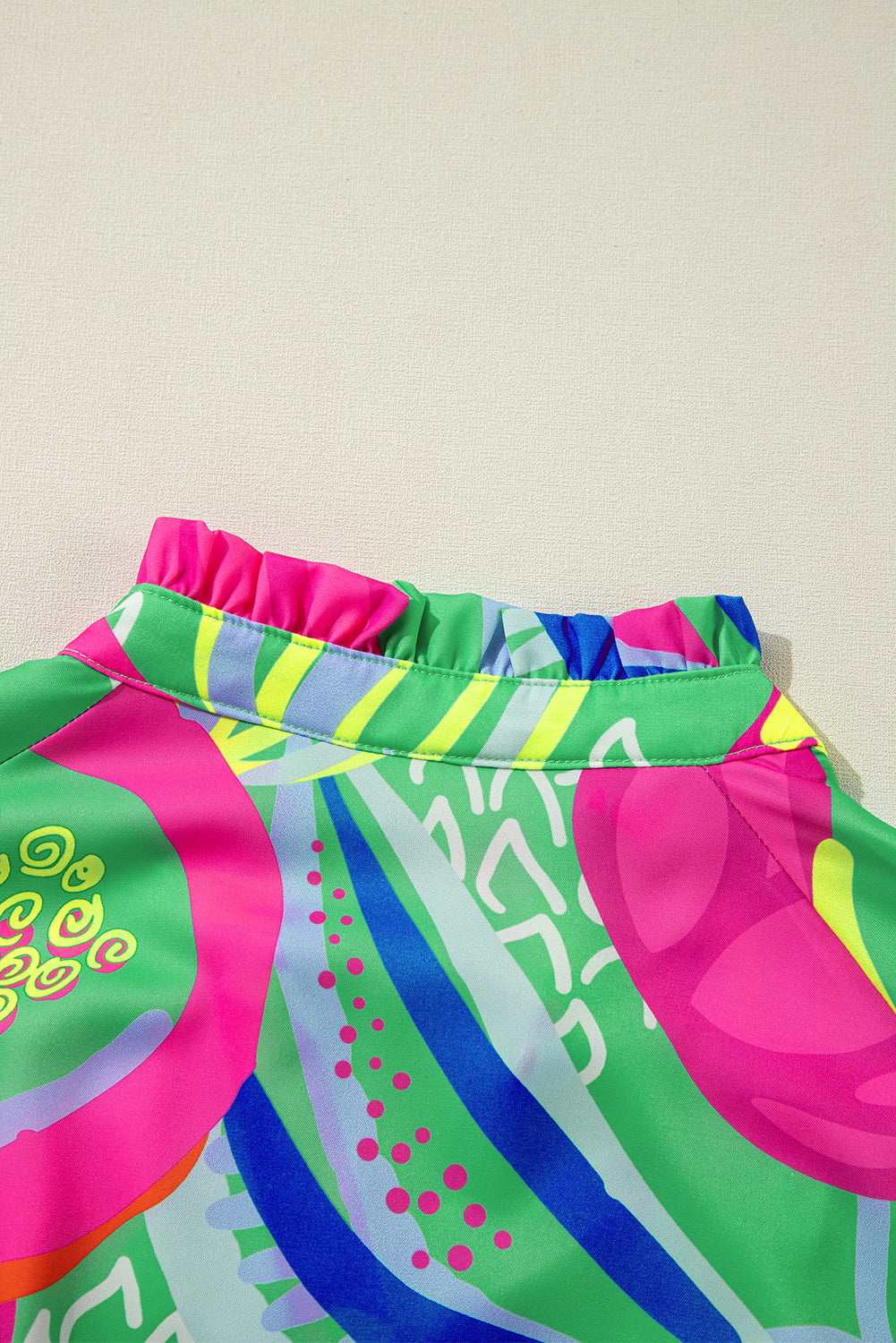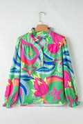Sale Green Abstract Print Ruffled Sleeve Buttoned V Neck Blouse