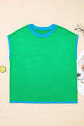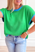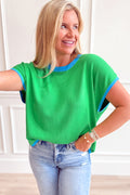 Green Contrast Trim Round Neck Short Sleeve Loose Knit Sweater