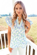 - Elegant floral print with contrasting stripes for added flairs.Flutter sleeves and a V-neck add a feminine touch.Easy dress up with shorts, jeans, and skirts for a chic look.Comfortable and versatile for day-to-night wear.