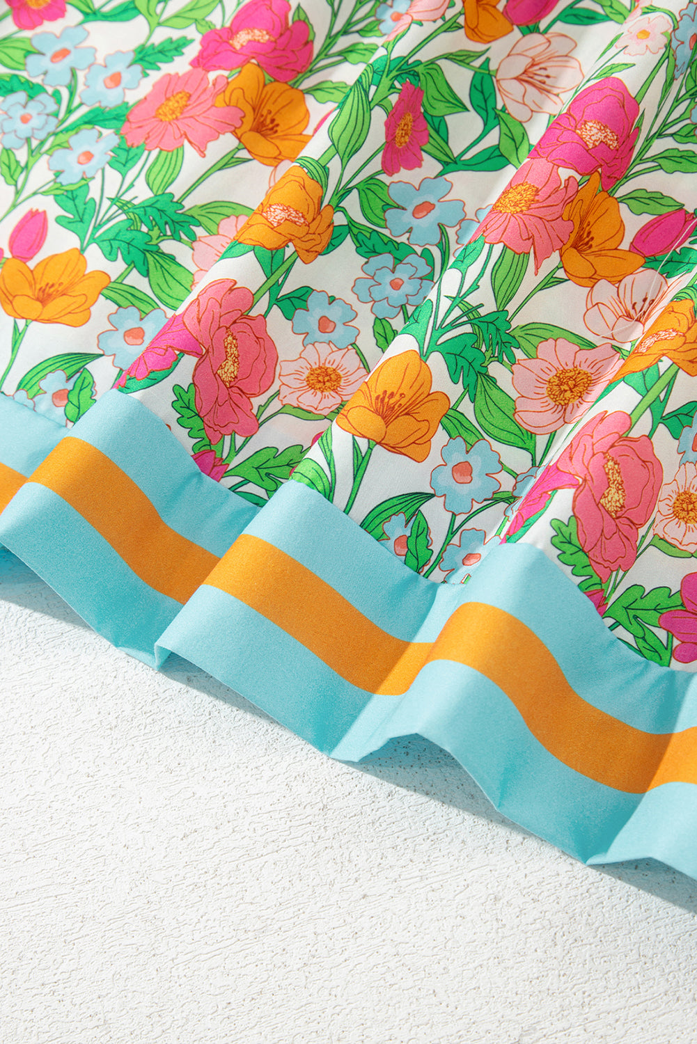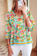 Sale Green Floral Print Striped Trim Tie Neck Puff Sleeve Babydoll Blouse