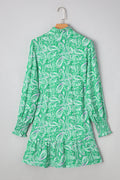 Green Paisley Print Long Sleeve Button Front Tied Waist Mini Dress