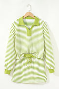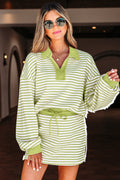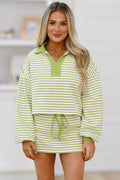 Green Stripe Collared V Neck Drop Shoulder Pullover and Skort 2pcs Outfit