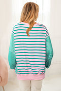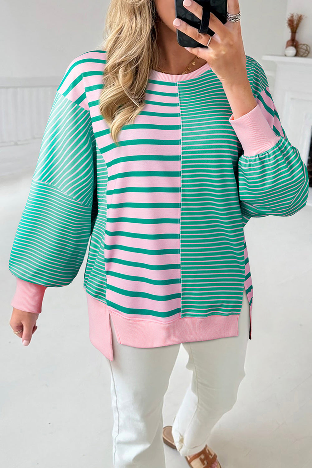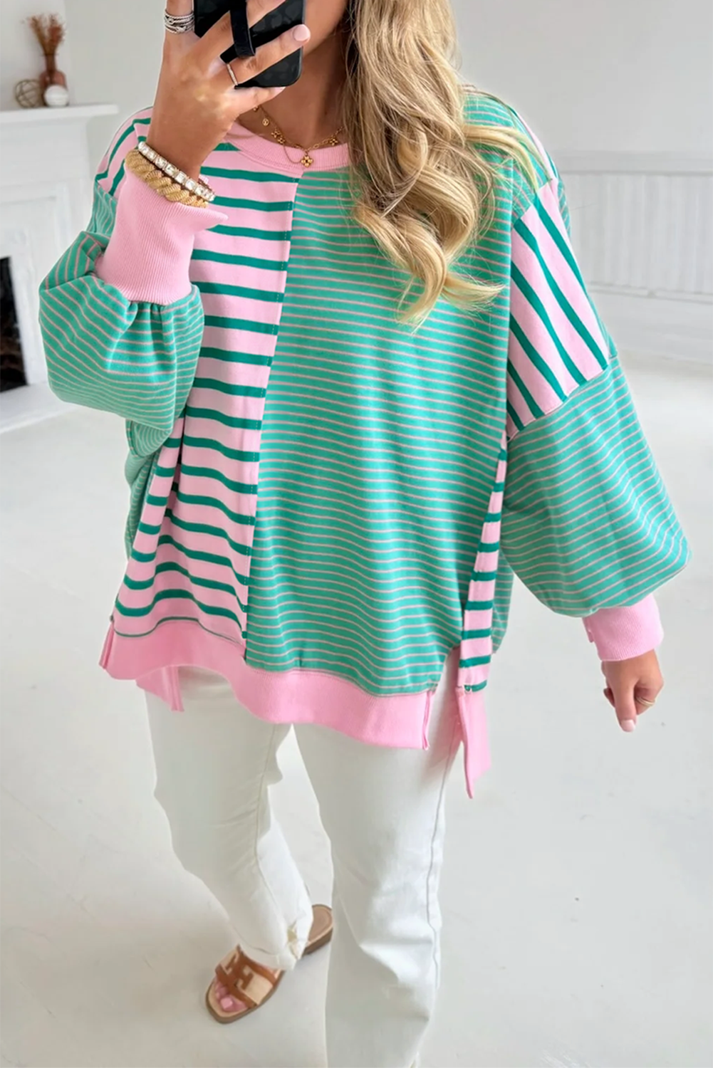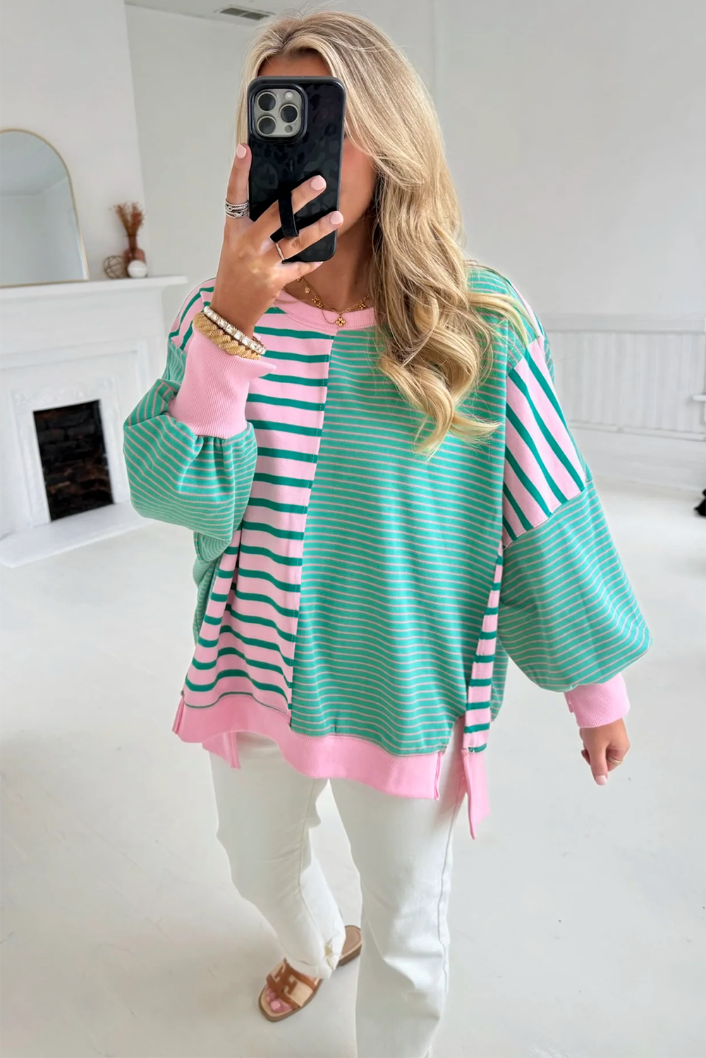 Green Stripe Mix Pattern Color Block Patchwork Side Slit Baggy Sweatshirt