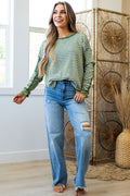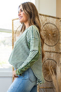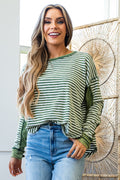 Green Stripe Thermal Knit Drop Shoulder Casual Top