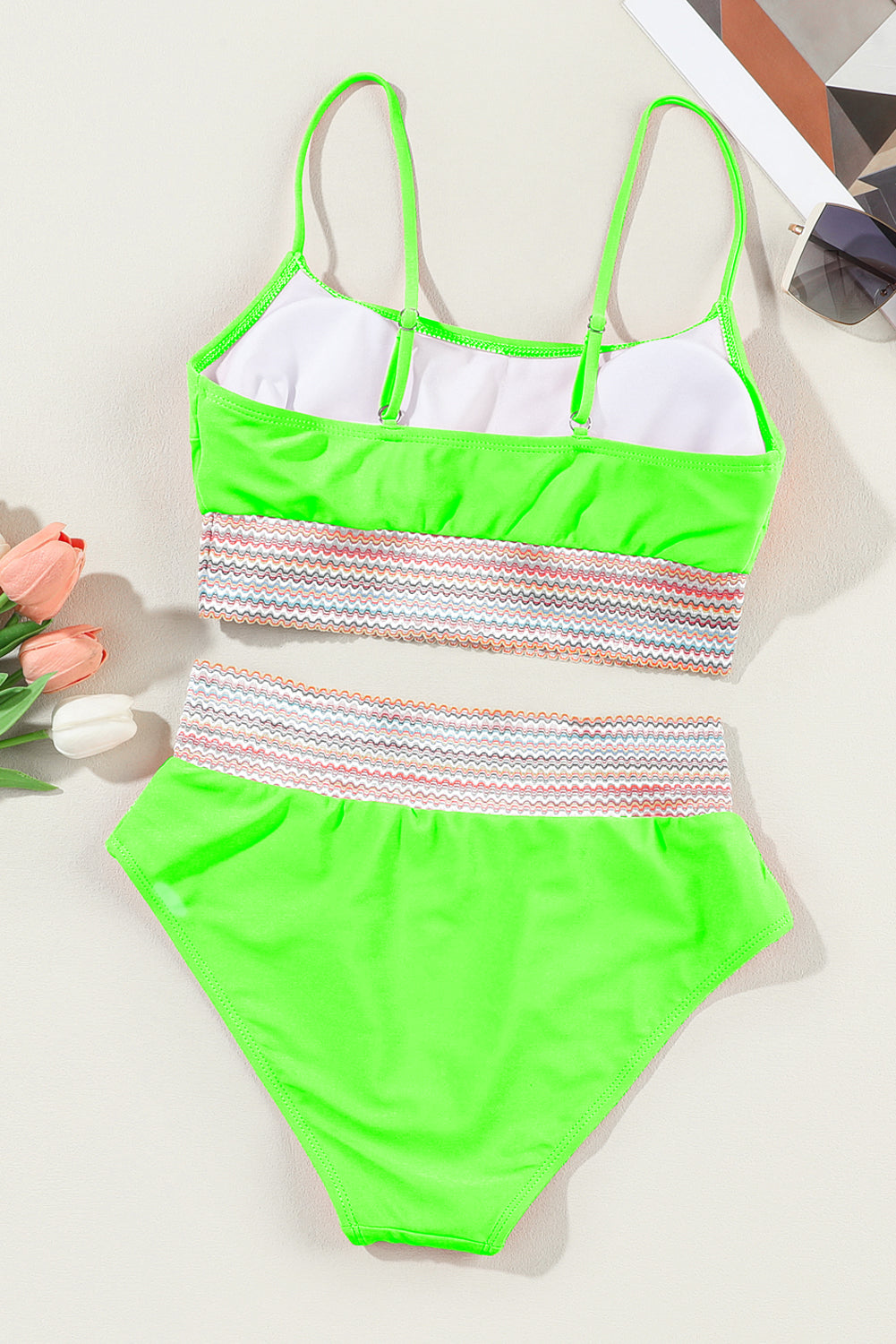 Green Striped Patchwork Spaghetti Strap High Waist Bikini Swimsuit