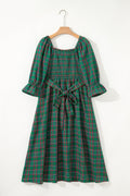 Green Tartan Plaid Square Neck Puff Sleeve Knot Waist Flared Midi Dress