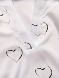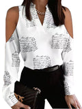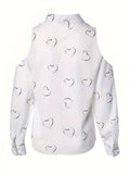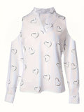 Heart Print Cold Shoulder Blouse, Casual V Neck Long Sleeve Blouse