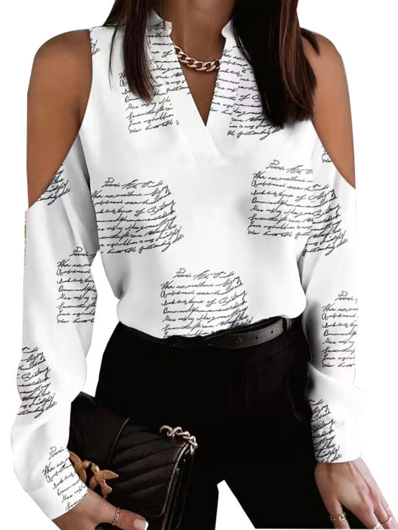 Sale Heart Print Cold Shoulder Blouse, Casual V Neck Long Sleeve Blouse
