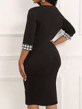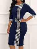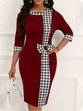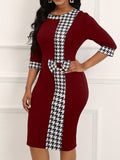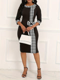 Sale Houndstooth Bodycon Dress, Elegant Crew Neck Long Sleeve Dress