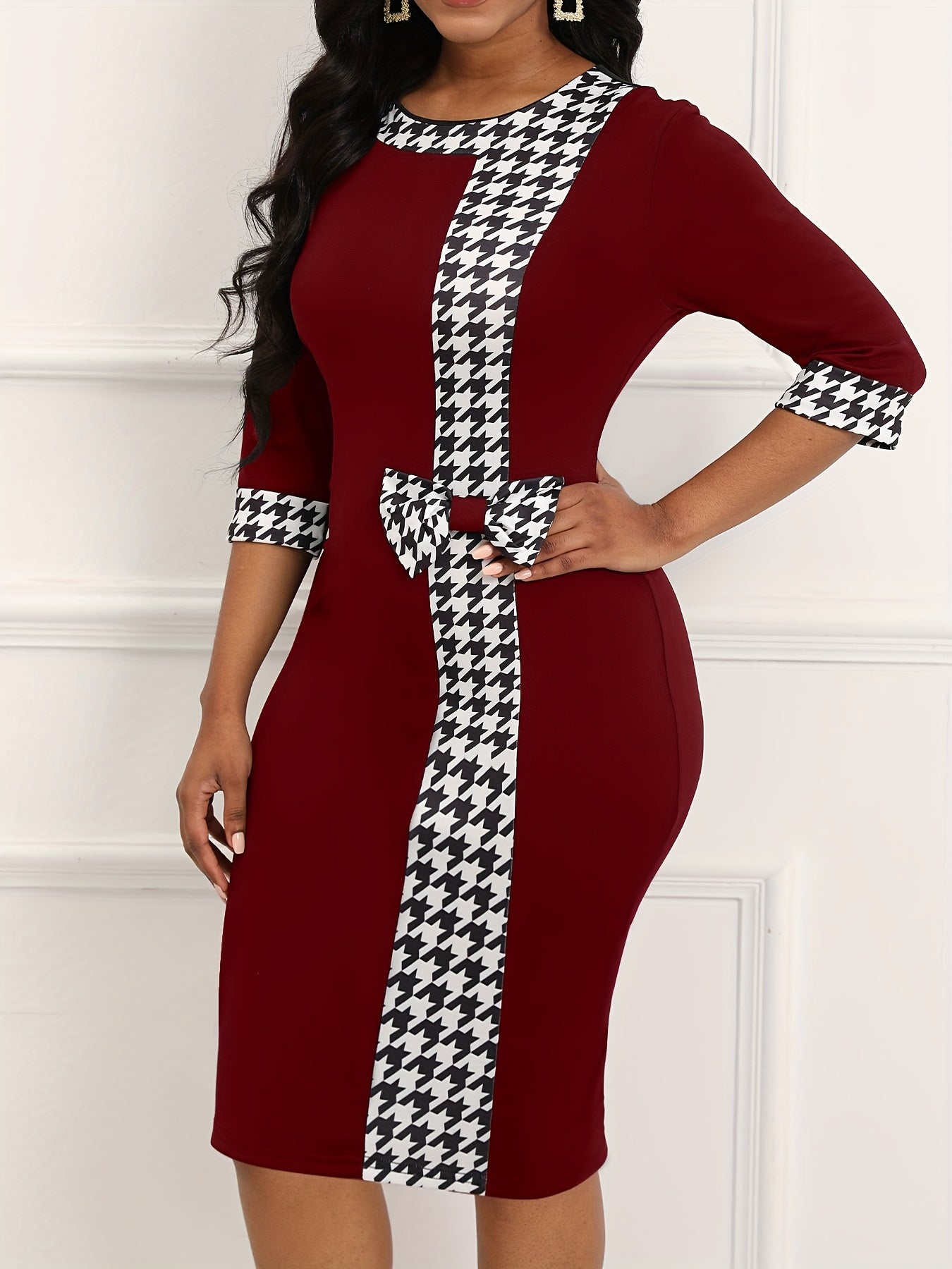 Houndstooth Bodycon Dress, Elegant Crew Neck Long Sleeve Dress